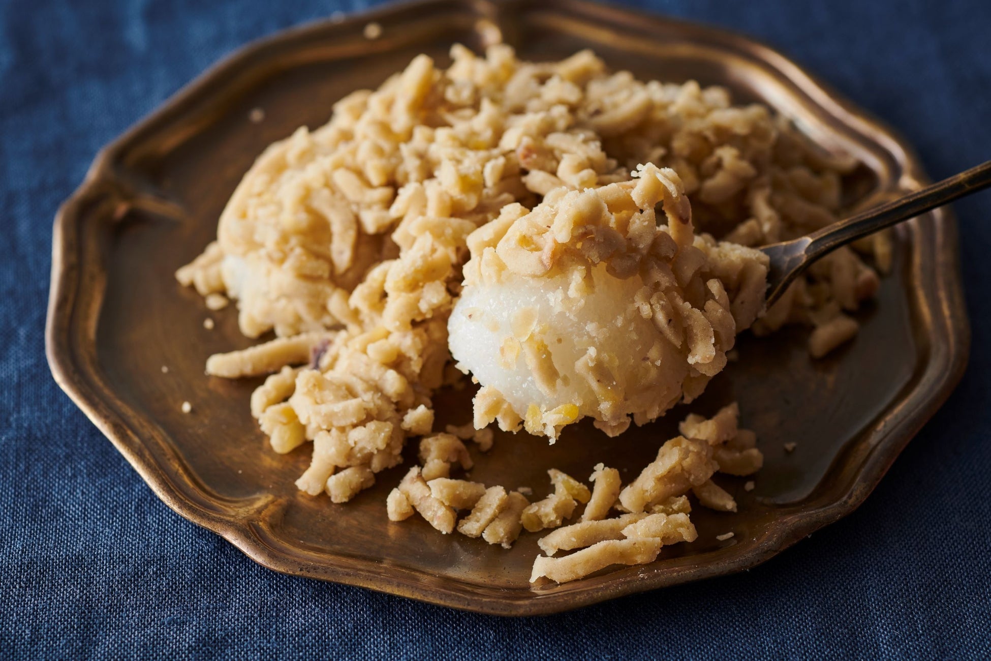 山形城下で200年以上の歴史を紡ぐ<乃し梅本舗 佐藤屋>からは、旬の栗を贅沢に味わうお菓子をご用意。粒の細かい京都風の頭道明寺(かしらどうみょうじ)の餅の周りに、茨城産の栗と砂糖だけで作るそぼろを敷き詰めたシンプルな一品。