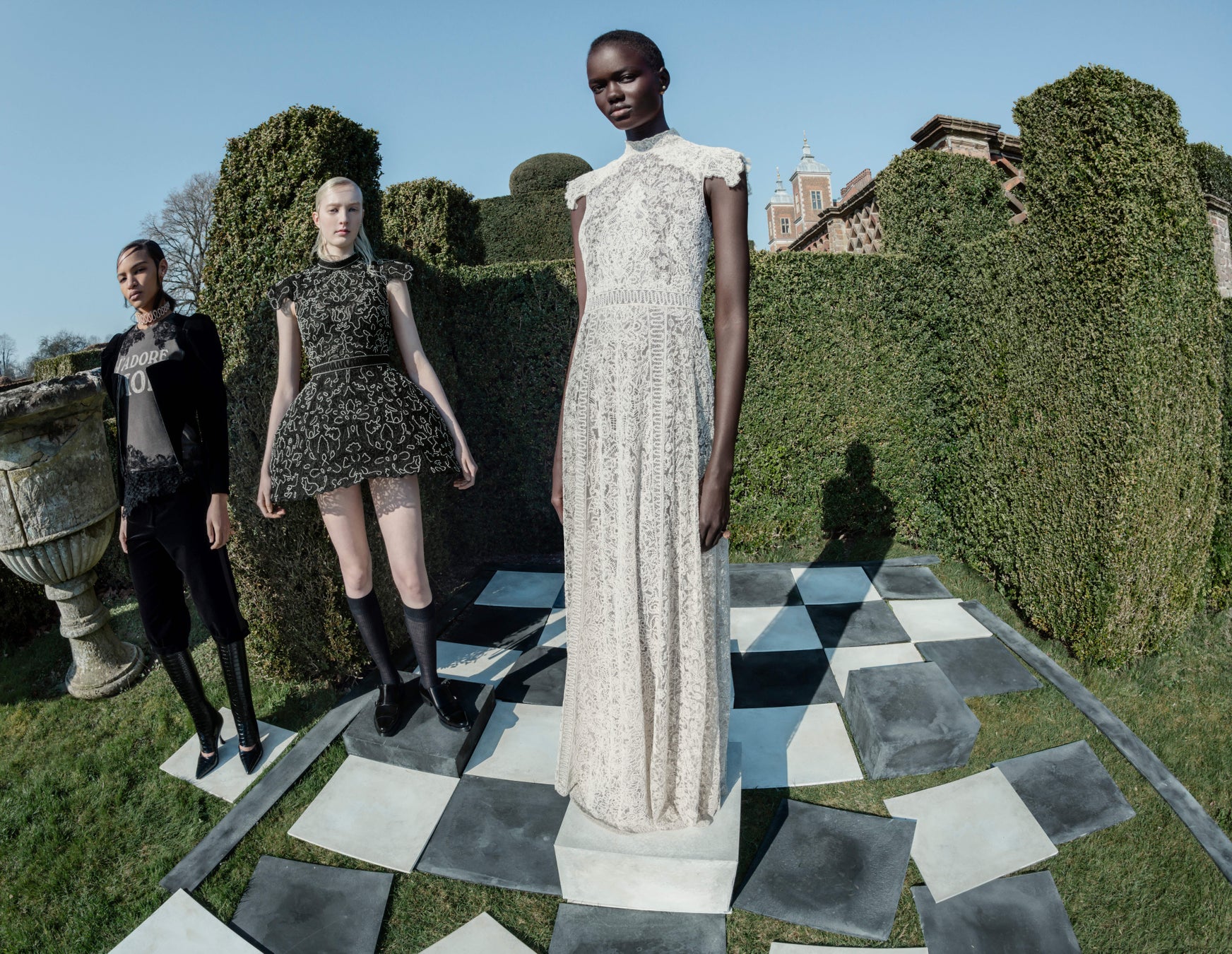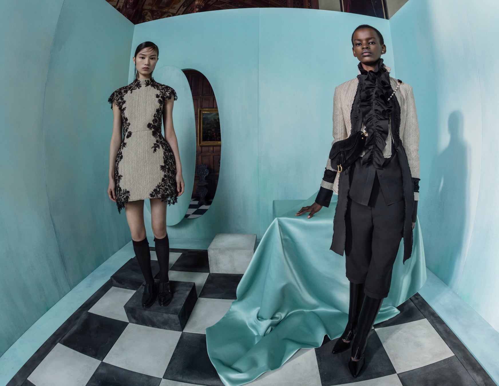 イギリスのハットフィールドハウスという夢のような舞台で、ルックはコンテンポラリーに再解釈されています。クリノリンドレスは動きに合わせて短くなり、ビスチェやコルセットはジッパーやシステムによってボリュームが強調されています。バリエーション豊かに展開される大胆なジャケットと非常に構造化されたコートには、繊細に作られたベルベットがあしらわれています。