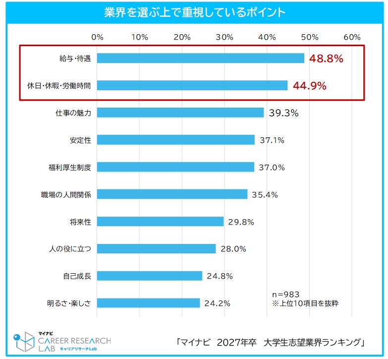 業界を選ぶ上で重視しているポイントを聞いたところ、「給与・待遇(48.8%)」、「休日・休暇・労働時間(44.9%)」が多くあげられた。業界選びにおいて仕事内容そのものよりも、待遇面を重視する学生が多いようだ。【図3】