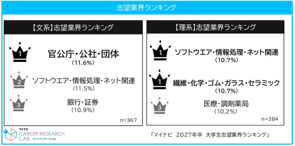 株式会社マイナビ(本社:東京都千代田区、代表取締役 社長執行役員:粟井俊介)は、2027年卒業予定の全国の大学生・大学院生を対象に実施した、「マイナビ 2027年卒 大学生志望業界ランキング」の結果を発表しました。