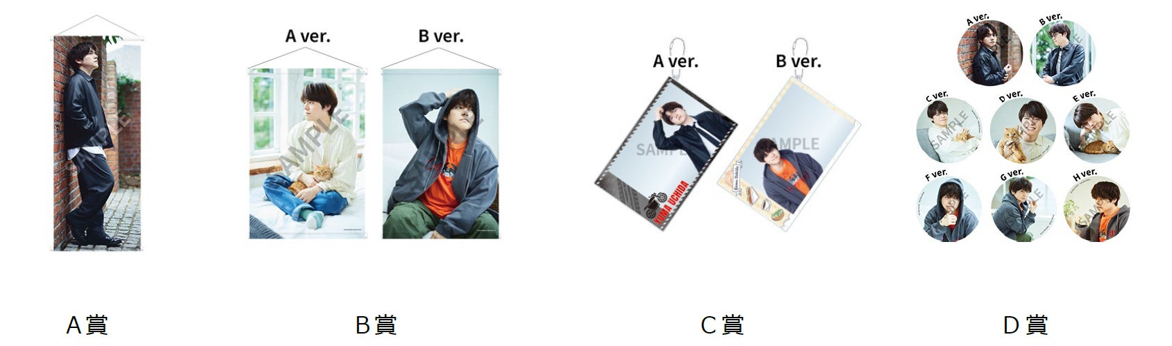 賞品のビジュアルには、全て撮り下ろしのデザインを採用。クールな印象のレザージャケット姿やアットホームな雰囲気があふれるパーカー姿、かわいい猫とのツーショットなど、ここでしか手に入らないファン必携のオリジナル賞品が勢ぞろい!目玉となる全身タペストリーをはじめ、B2タペストリー(2種)、アクリルカード(2種)、缶バッジ(8種)まで、豊富なアイテムを取り揃えています。賞品がなくなり次第終了となりますので、是非、お早めにチャレンジください!
