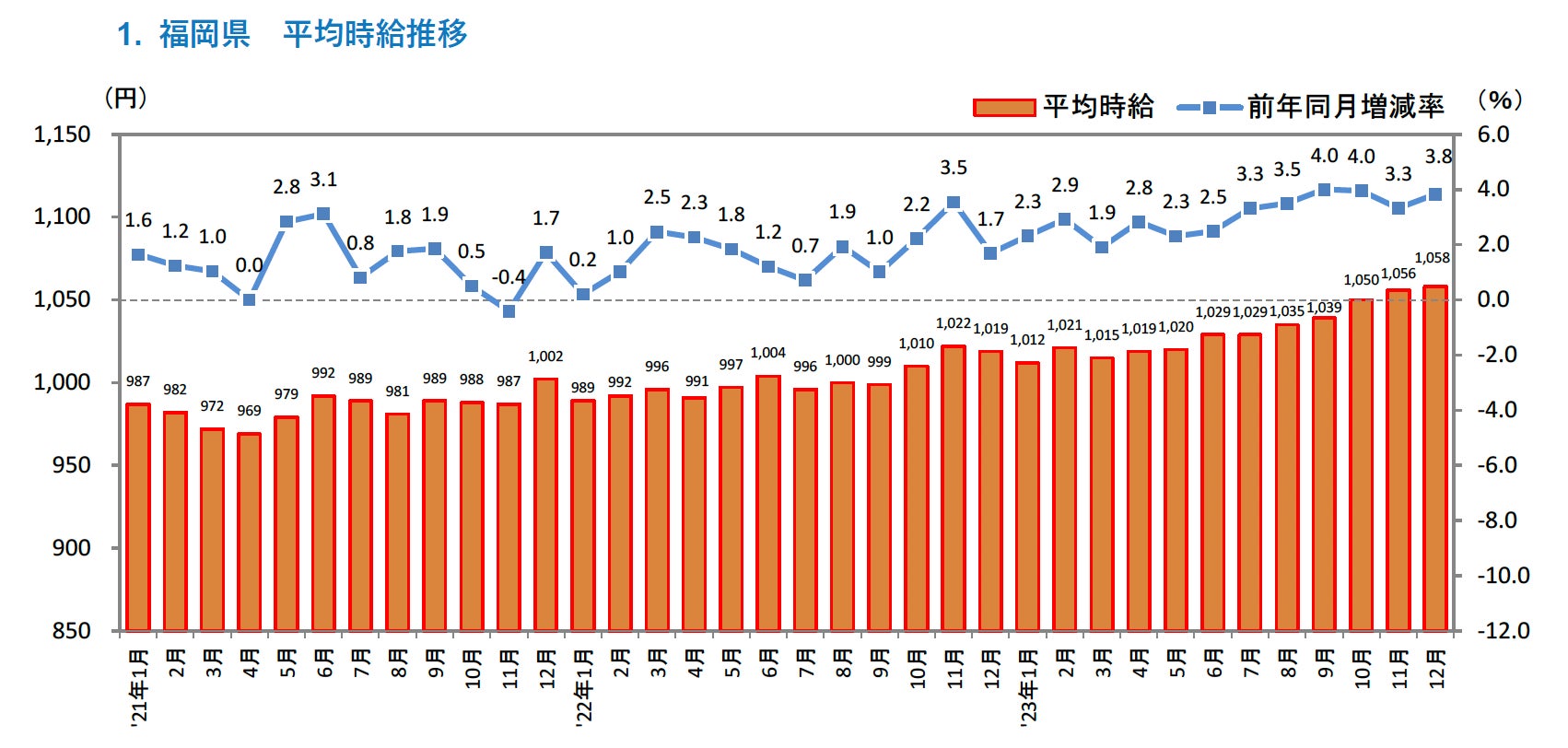■福岡県の平均時給は1,058円(前年同月1,019円、前月1,056円)