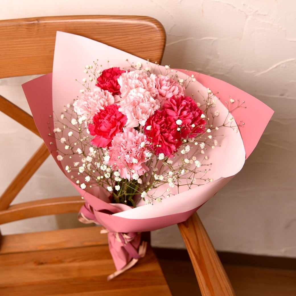 ピンクのカーネーションとふわふわのカスミ草を合わせた定番の母の日ブーケです。