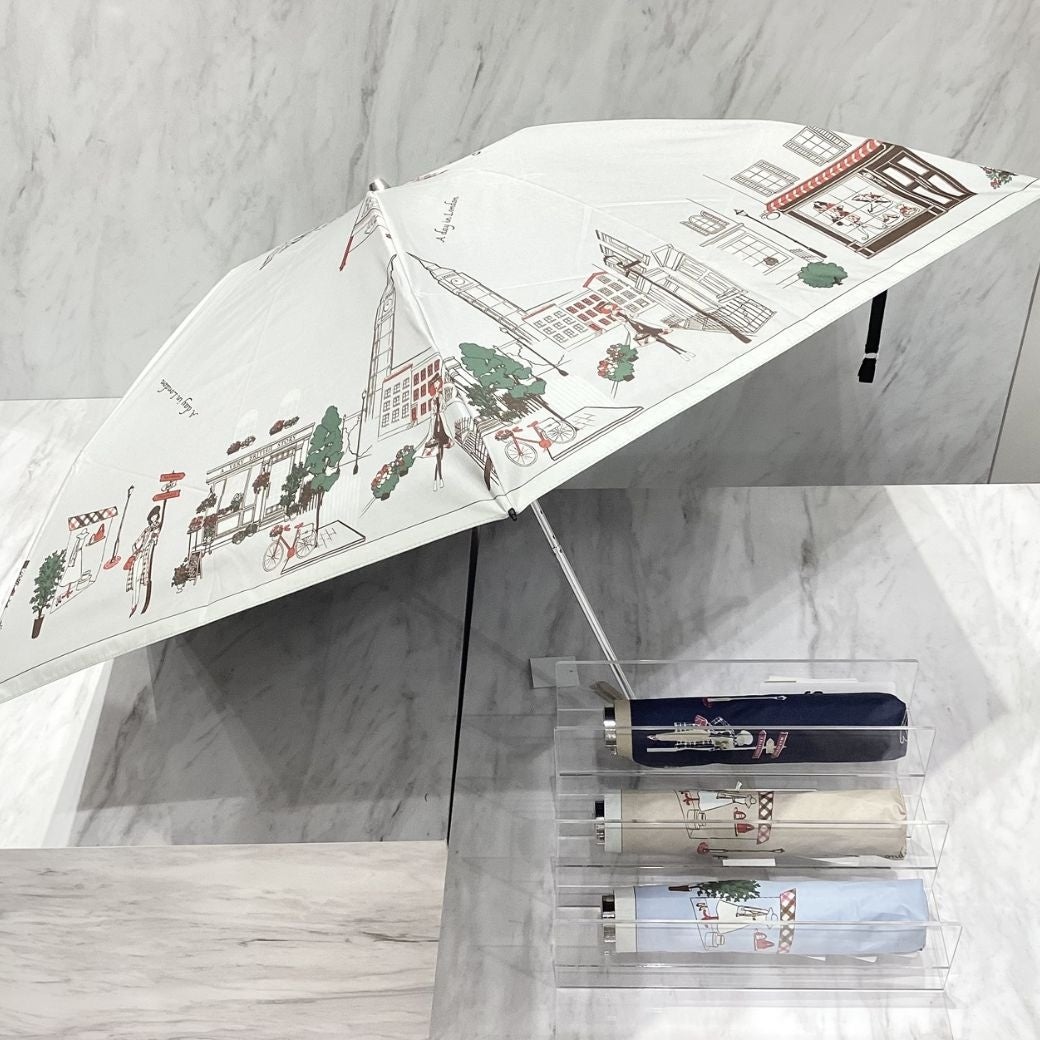 カラフルなタッチで描かれた街並みに惹かれる晴雨兼用ミニ傘。