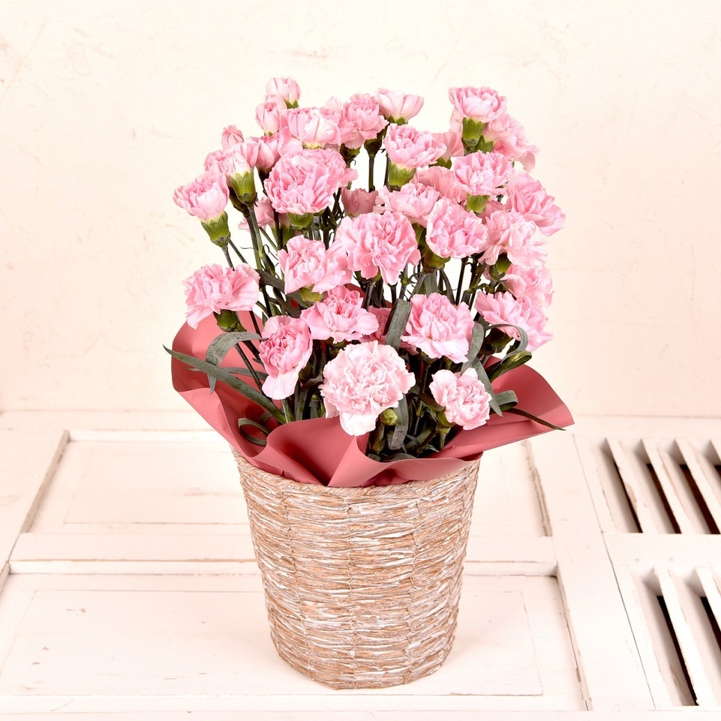 フラワーデコオリジナルのバスケットとセットになったカーネーションの鉢植えです。