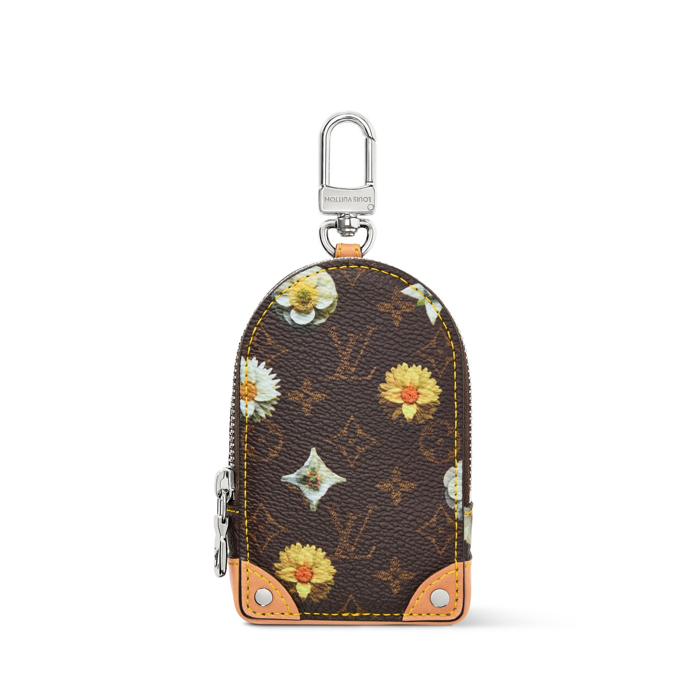 バッグやベルトループに取付けるのに最適なサイズの「モノグラム·フラワー ポーチ」。ファスナー付きのケースには、鍵やクレジットカード、ワイヤレスイヤホンなどを収納できます。スプリング·コレクションのテーマをフローラルに再解釈したパターンが機能的なデザインにモダンな魅力を添え、シルバーカラーのビス(鋲)をあしらったレザーのコーナー部分は、メゾンのトランク製造の伝統を想起させます。