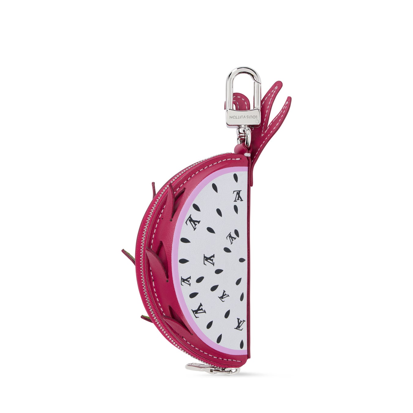 トロピカルフルーツのコードを再解釈した、ポーチとしても使えるレザーの「バッグチャーム·LVドラゴンフルーツ」。印象的なピンクの果皮に包み、ドラゴンフルーツの象徴ともいえる種をLV ロゴをさりげなく散りばめて表現。ファスナー開閉式で、鍵やワイヤレスイヤホンを収納することができます。