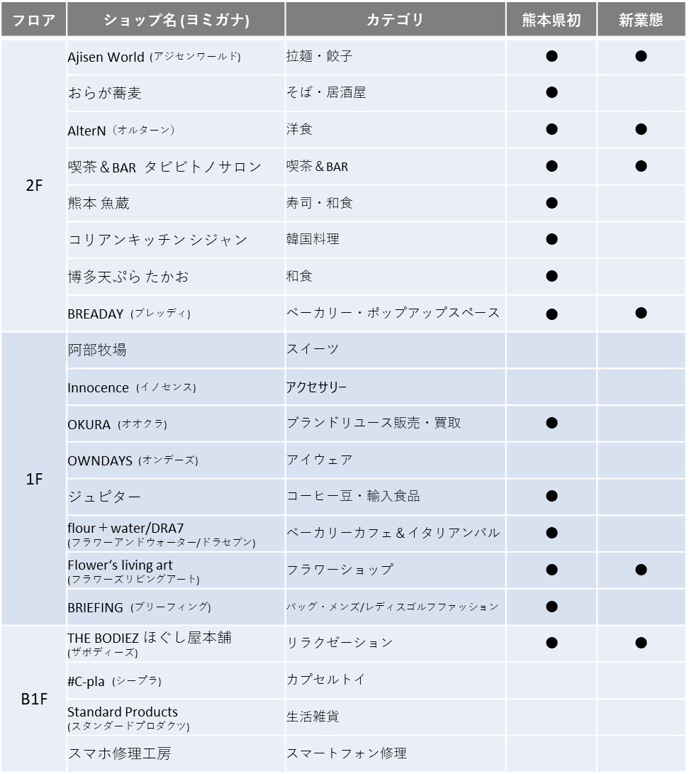福岡の人気ベーカリー・パンストックがアドバイザーを務め、地域食材を使ったパンなどを扱うベーカリー「BREADAY」、熊本市上乃裏の「瑠璃庵」「夜香木」に次ぐ3店舗目となる姉妹店、熊本食材をふんだんに使ったレストラン「AlterN」などが2Fに出店。また熊本を拠点とし、世界15ヶ国で展開中の味千拉麺による新業態「Ajisen World」、熊本県初出店となる福岡の人気店「博多 天ぷらたかお」などが軒を連ねます。