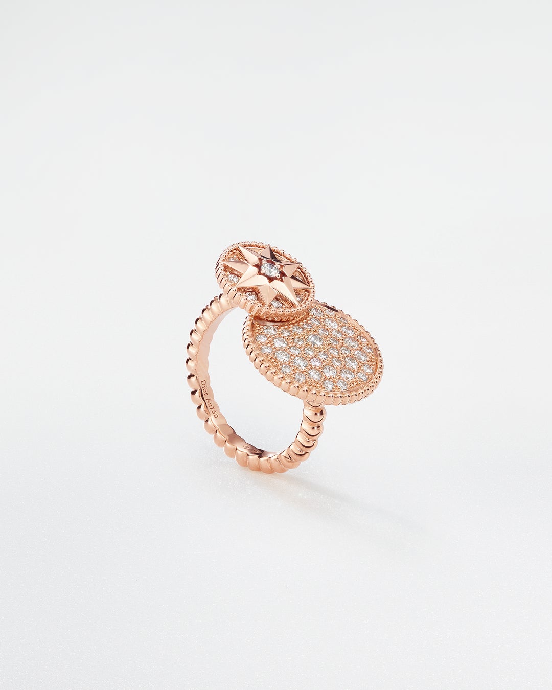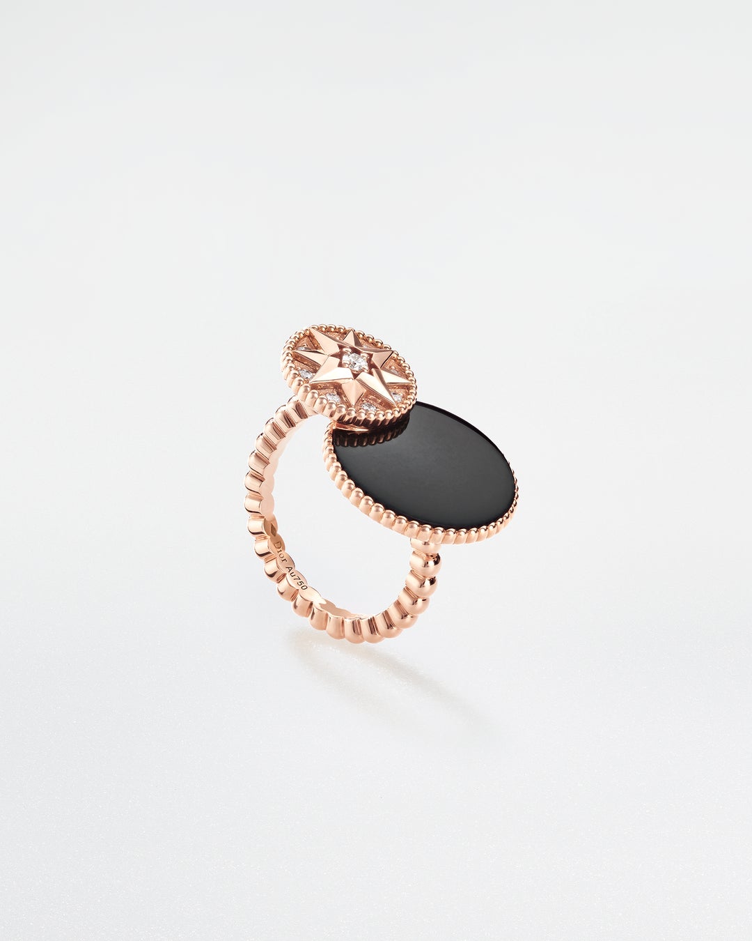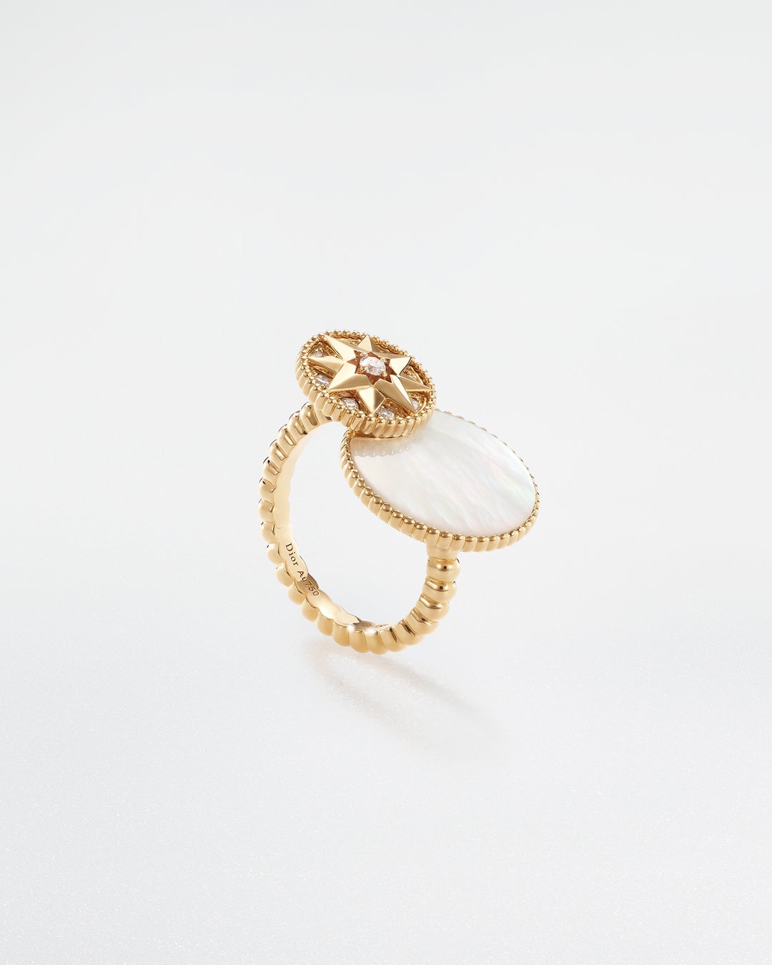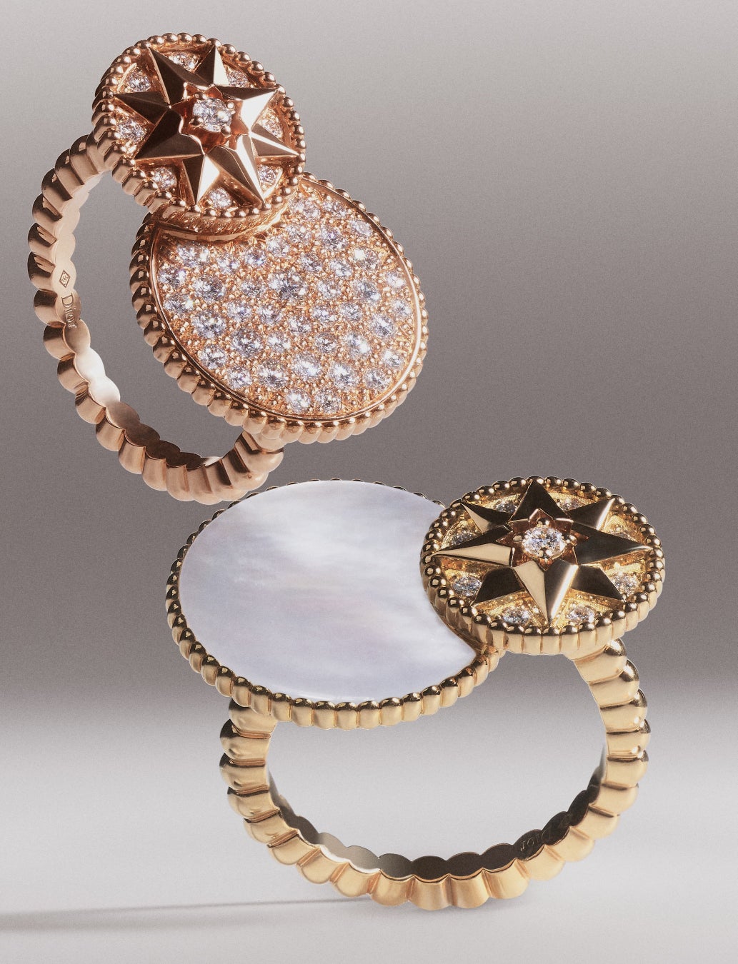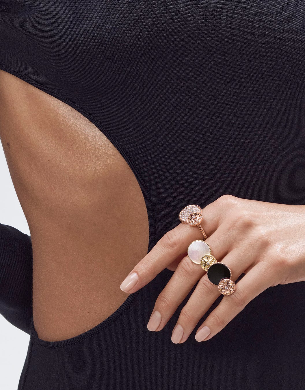 船乗りが用いるロープを連想させるライスグレインモチーフのゴールドで縁取られたメダイヨンは、クリスチャン・ディオールのラッキーナンバーを彷彿とさせる八芒星に解釈したコンパスローズが配され、一石のダイヤモンドをあしらいます。もう片面には、マザーオブパール、ピンクオパール、オニキスやマラカイトなどのカラーストーンをあしらい、メダイヨンの魅力を引き立てます。