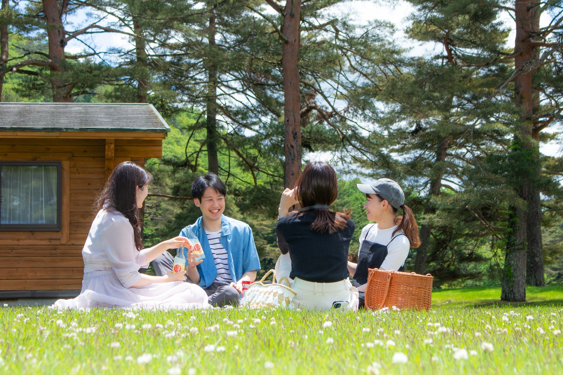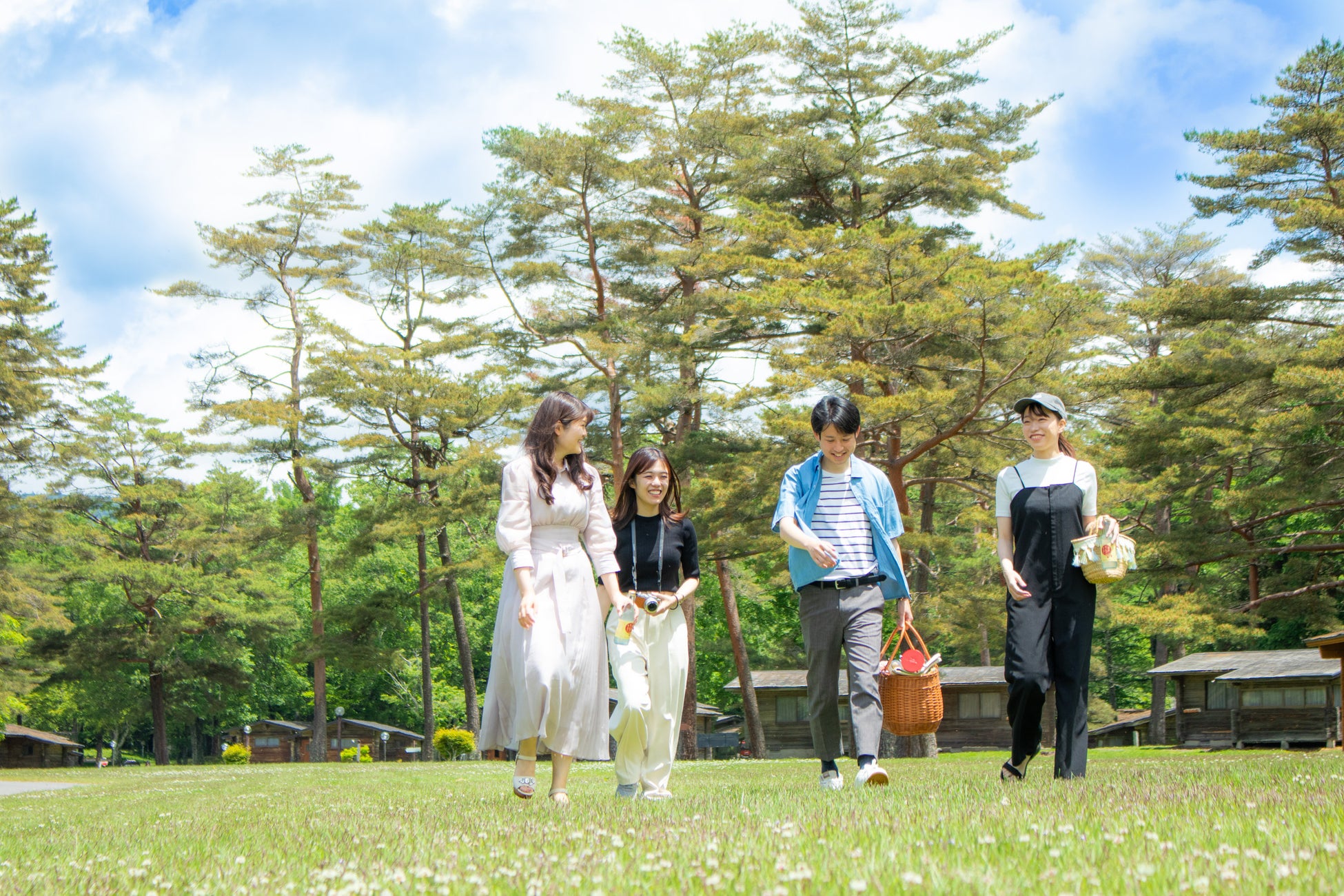 コテージに泊まって、ピクニック感覚で「信州りんごサイダー」を片手にランタンスピーカーで音楽を流して芝生の上でまったりと過ごすチル体験、ホテル敷地内の森に自生する樹木から抽出したアロマの香りに癒やされる、軽井沢で自然界隈をより満喫できる1日1室限定のプランです。周りを気にせず仲間同士で自然界隈を満喫いただけます。