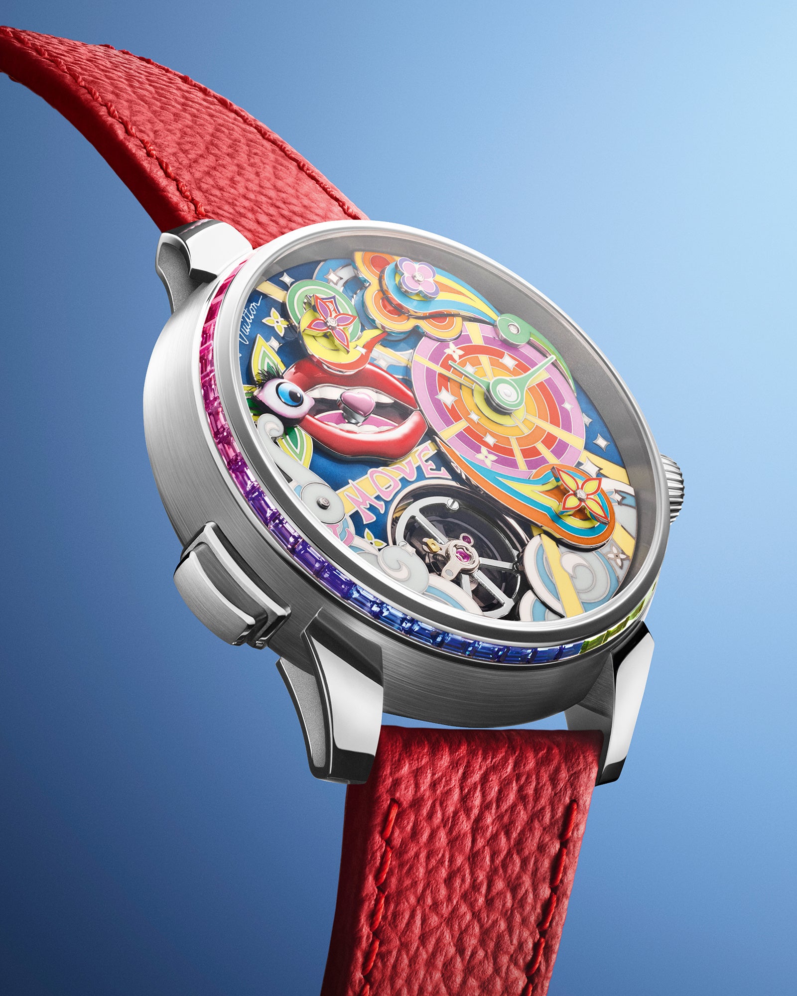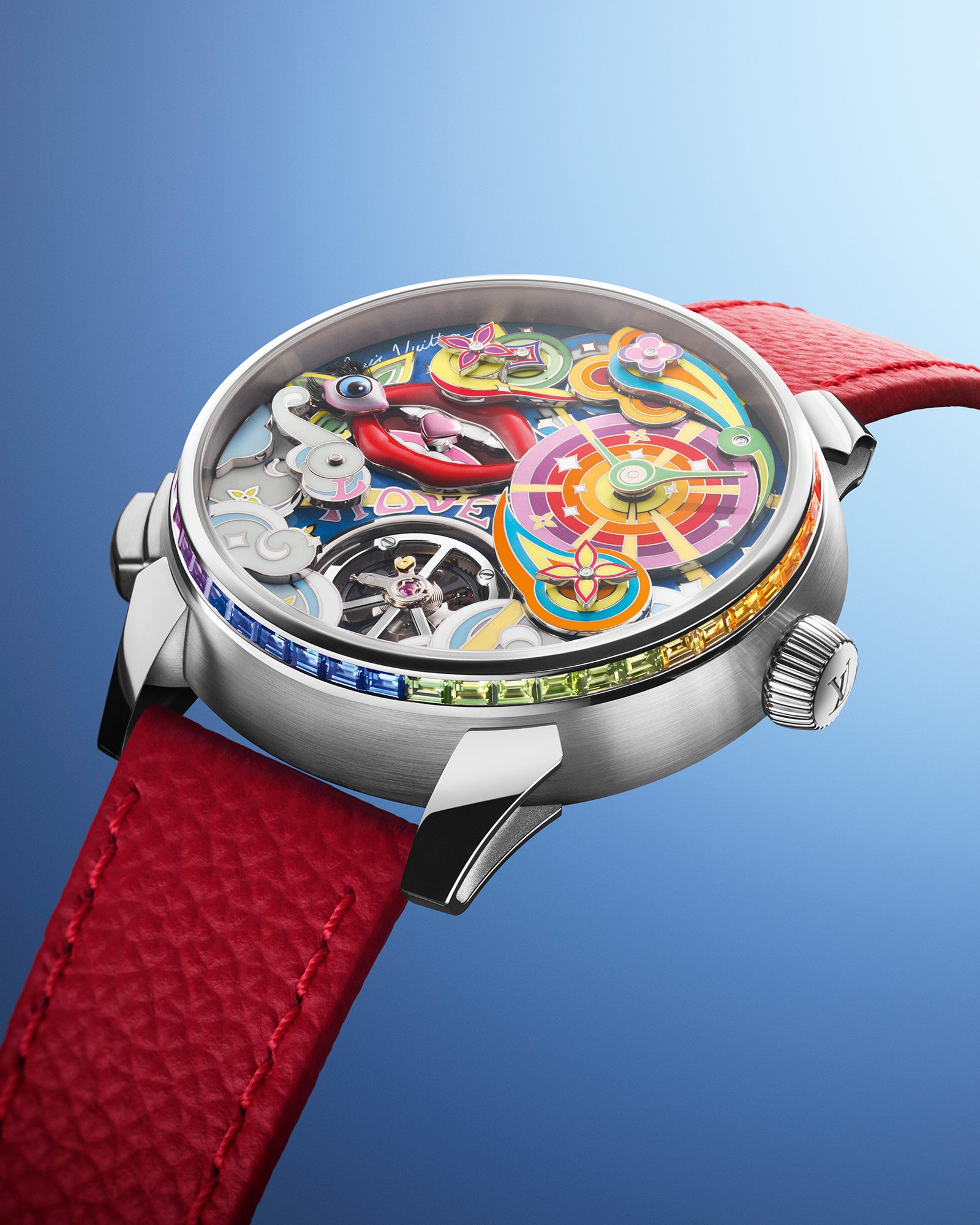 独創的なデザインセンス、卓越したサヴォアフェール、技術的な妙技を融合させた「タンブール タイコ アーティー·オートマタ」は、ルイ·ヴィトンの最も大胆なハイウォッチメイキング ピースのシグネチャーを余すところなく結集しています。モノグラム·フラワーのパワーが弾ける、遊び心に満ちたクリエーションは、ポップな感性をまとった虹色の夢の世界の中で、躍動する愛を描き出します。