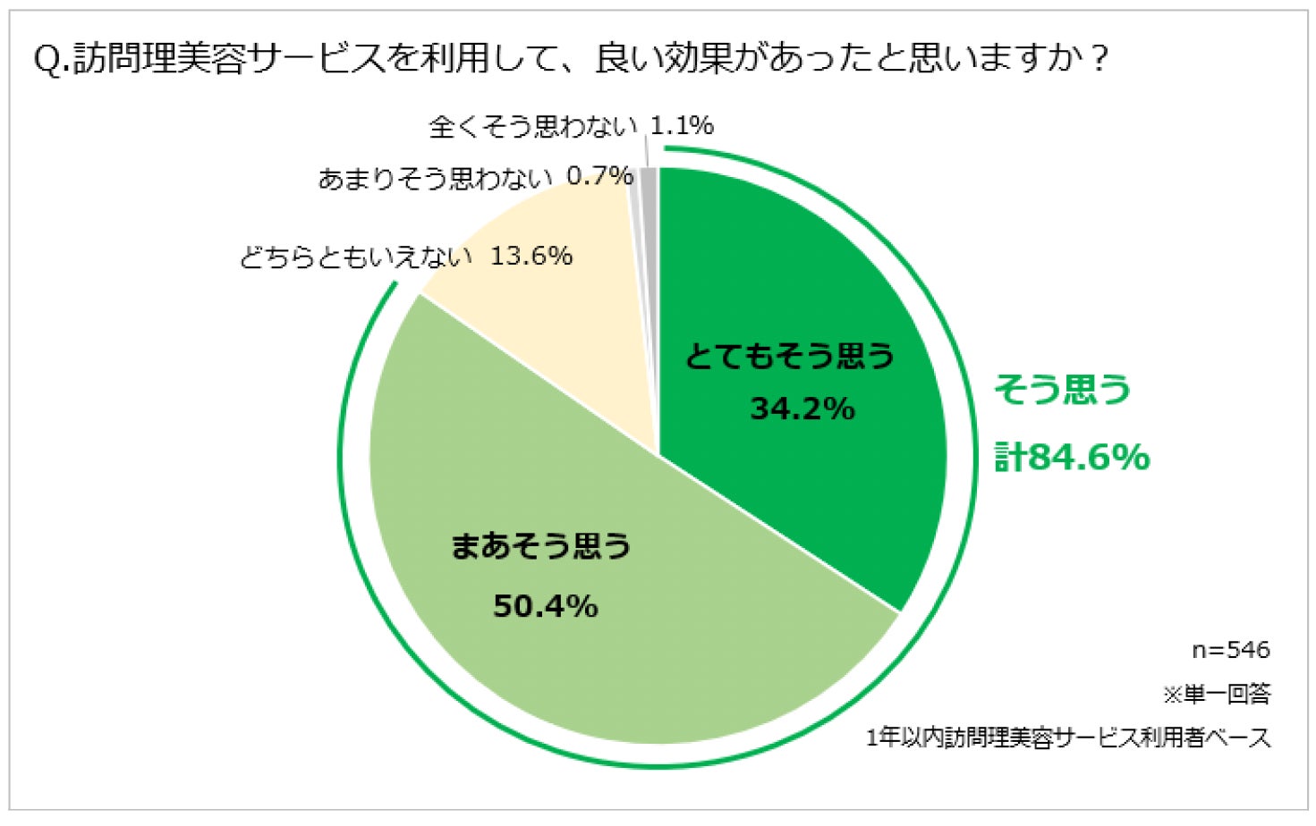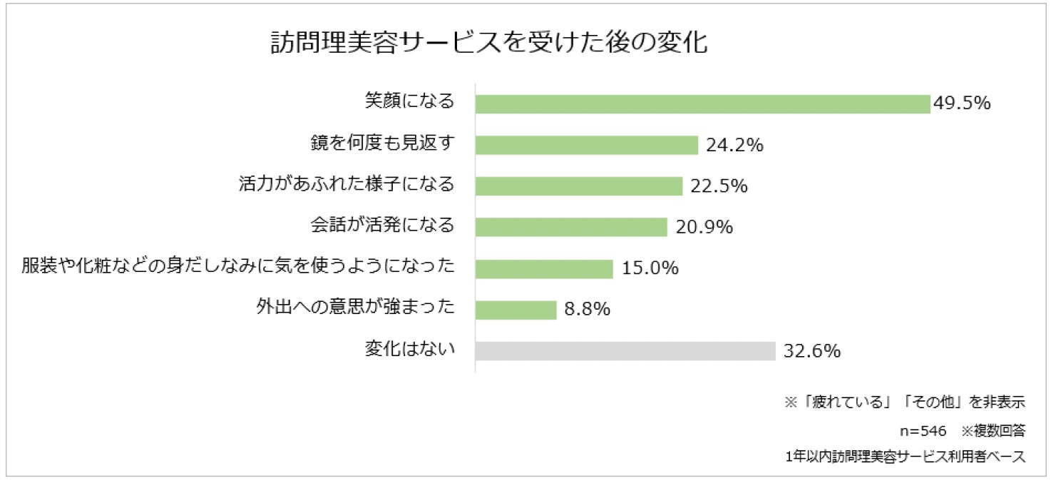訪問理美容サービスを利用して、何らかの良い効果を与えていると感じているご家族の割合は84.6%と高い。サービスを受けた後の具体的な変化は「笑顔になる」が49.5%と最も高く、「鏡を何度も見返す(24.2%)」「活力があふれた様子になる(22.5%)」「会話が活発になる(20.9%)」が続く。