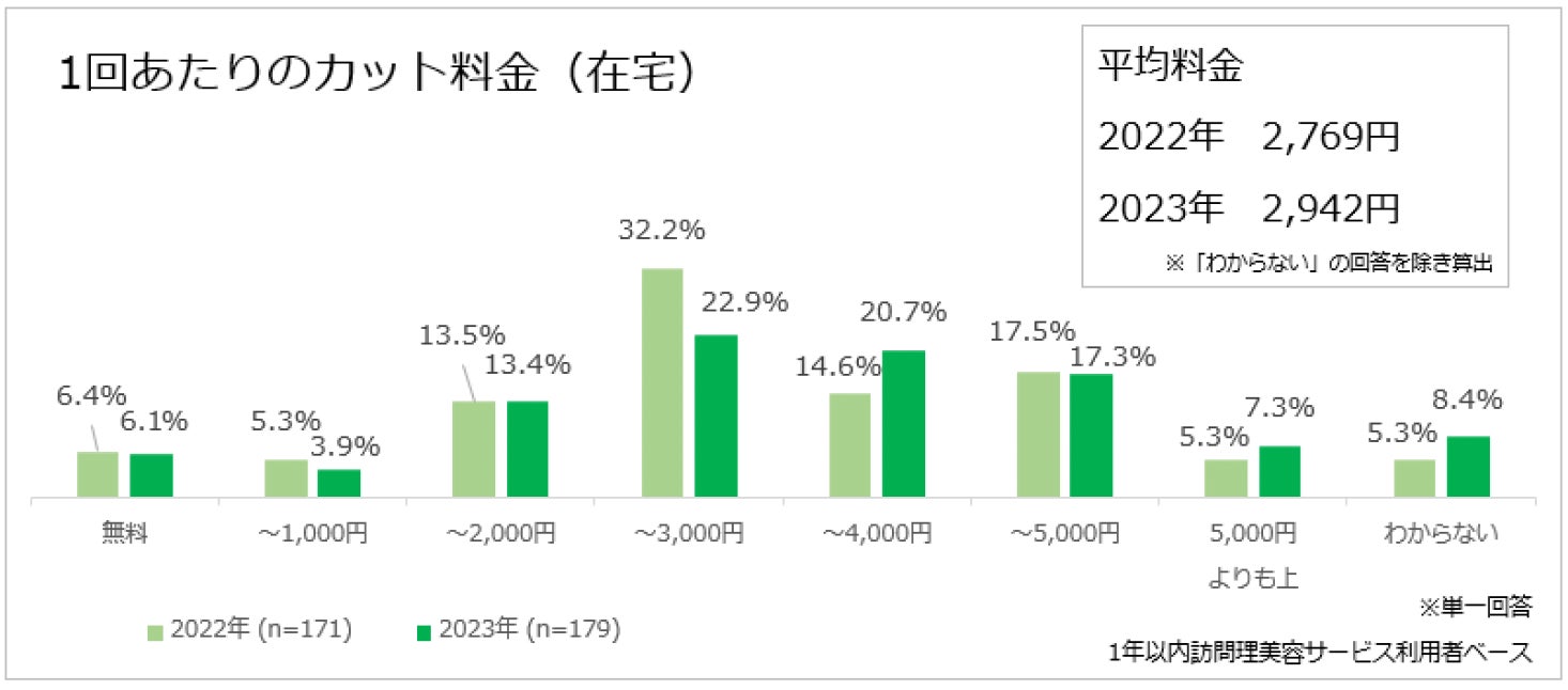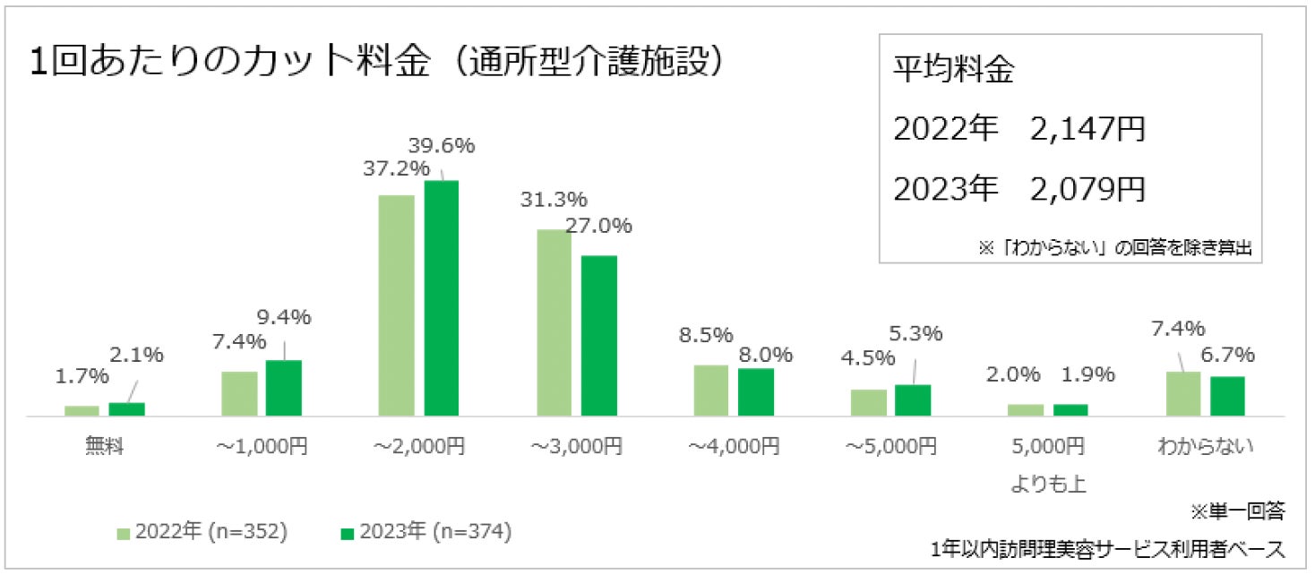 サービス利用者のうち「ヘアカット」は96.7%、「シャンプー」は43.5%、「髭剃り・うぶげそり」は30.2%の方が利用したことがあると回答している。カットの平均料金は通所型介護施設では-68円とほぼ横ばい、在宅では173円アップ。料金の分布をみると通所型介護施設ではあまり大きな変化がない一方で、在宅では3,000円以下の低価格帯が減少、「~4,000円」「5,000円よりも上」の高価格帯が増加している。
