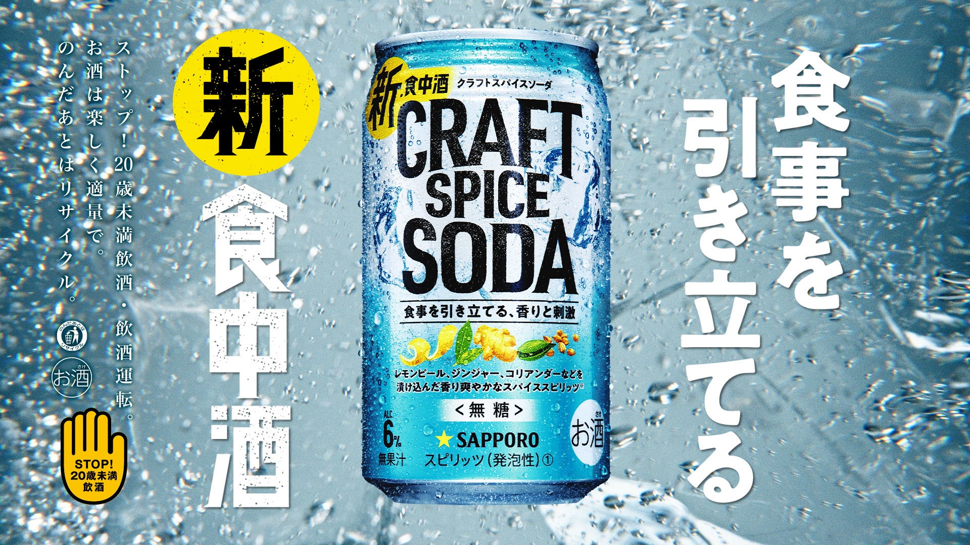 「サッポロ クラフトスパイスソーダ」は食事を引き立てる、甘くないおいしさの新しい食中酒です。レモンピール、ジンジャー、コリアンダーなどを漬け込んだ香り爽やかなスパイススピリッツを採用しました。“食事に合う”お酒とは一線を画すスパイスの香りと炭酸の刺激で、毎日の食事をグッとおいしく引き立てます。