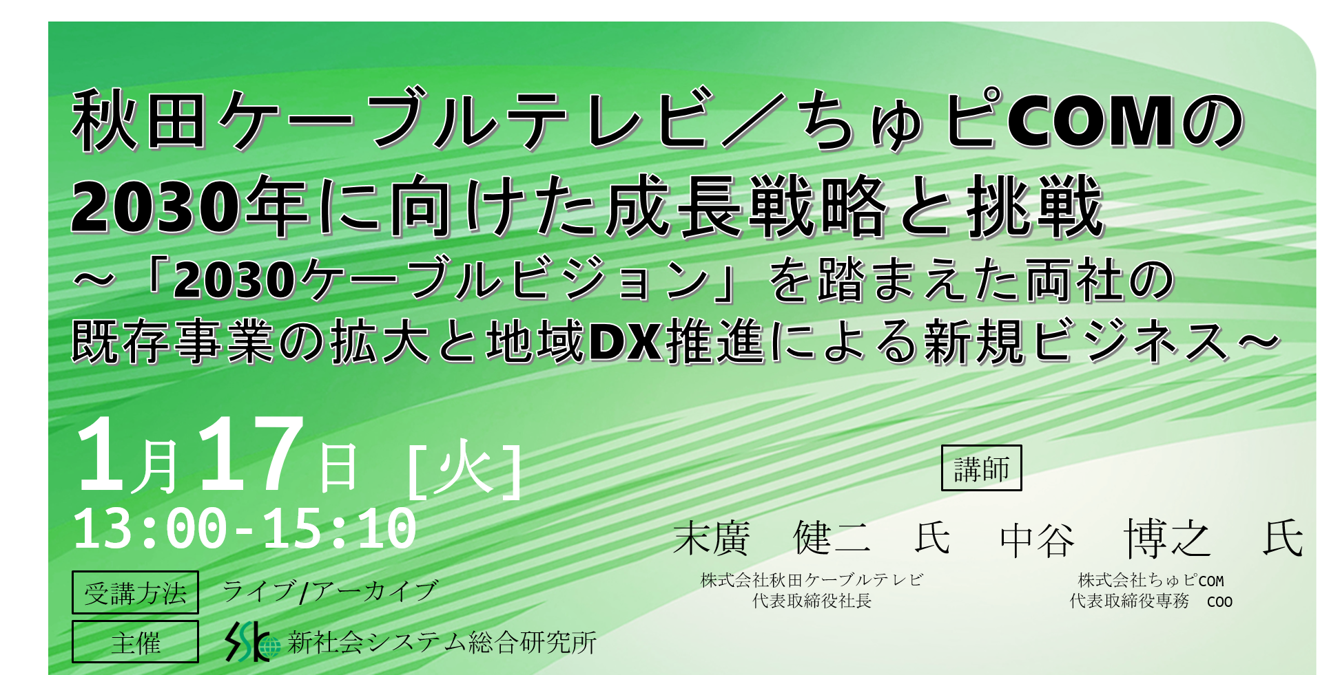 「秋田ケーブルテレビ/ちゅピCOMの2030年に向けた成長戦略と挑戦」と題して、(株)秋田ケーブルテレビ 末廣氏/(株)ちゅピCOM 中谷氏によるセミナーを2023年1月17日(火)に開催!!
