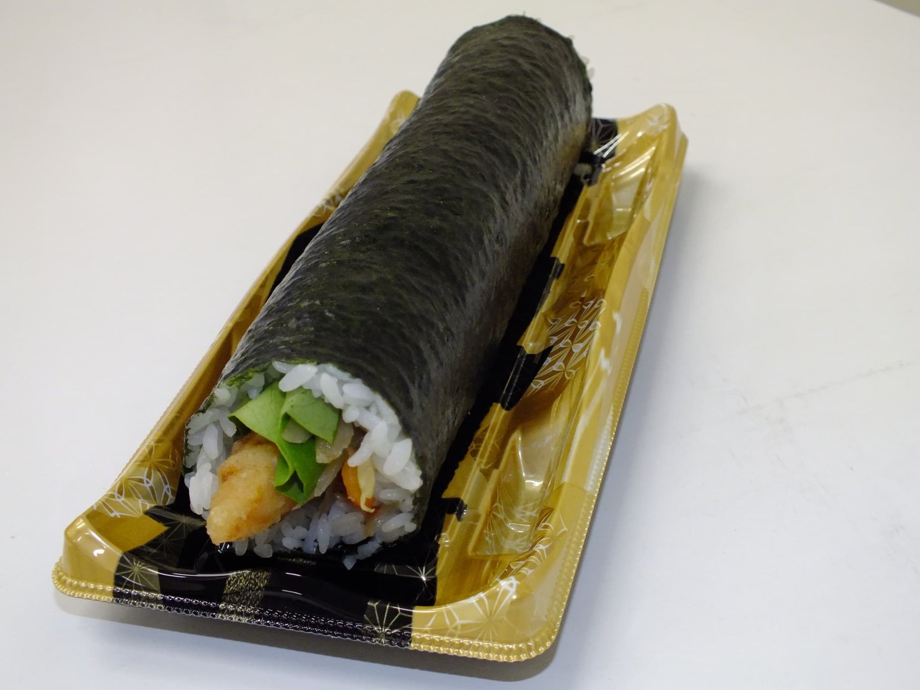 6種の海鮮(いか、サーモン、えび、ししゃも卵、まぐろたたき、数の子)と玉子焼き、きゅうりを巻いた恵方巻です。