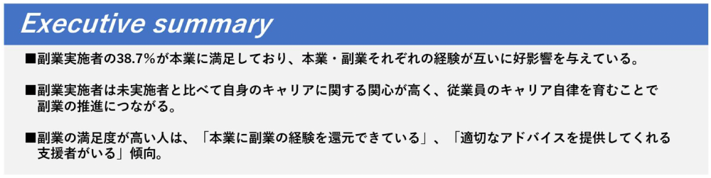 今回の分析では、副業実施者は非実施者と比較して、本業への満足度が高く、かつ、キャリアへの関心が高いことが分かりました。自社の社員の副業を推進したい企業にとっては、社員の満足度が高まるような業務の差配や職場づくり、社員のキャリアへの関心が高まるような職場でのコミュニケーションを実施することが成功の鍵となると言えるかもしれません。