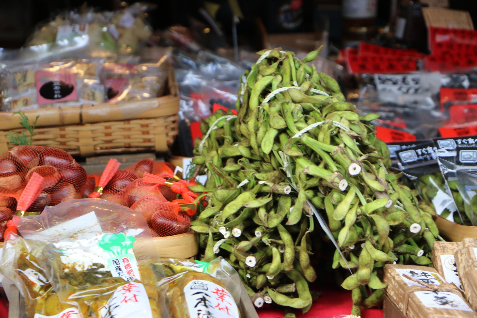 【丹波篠山おみやげ森本】で評判の『焼き栗』と丹波篠山の特産物のひとつ『黒枝豆』を試食させていただきます。