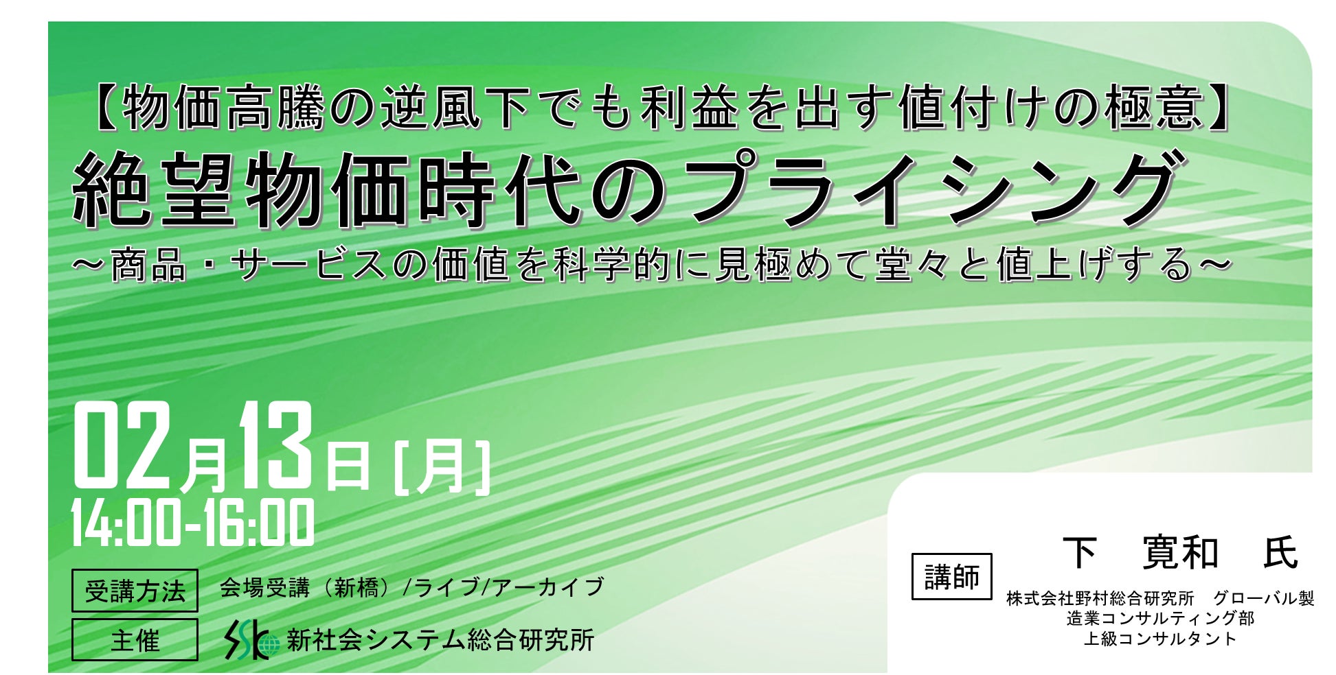 「絶望物価時代のプライシング」と題して、株式会社野村総合研究所 グローバル製造業コンサルティング部上級コンサルタント 下 寛和氏のセミナーを2023年2月13日(月)に開催!!