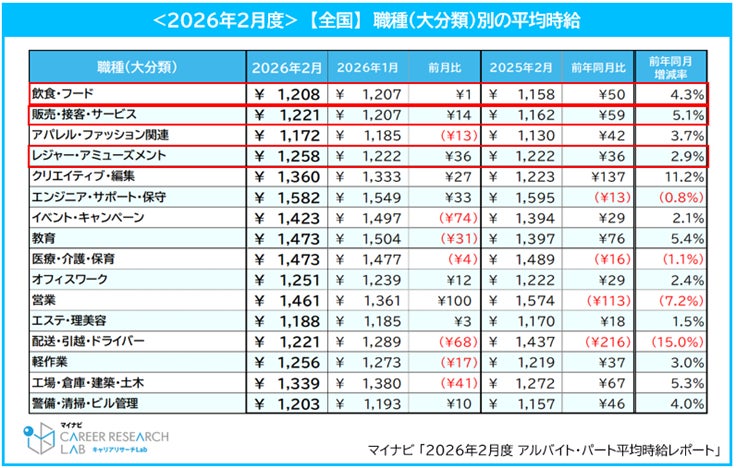 マイナビ、「2026年2月度アルバイト・パート平均時給レポート」を発表