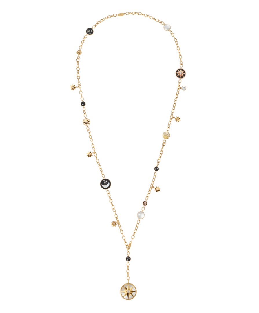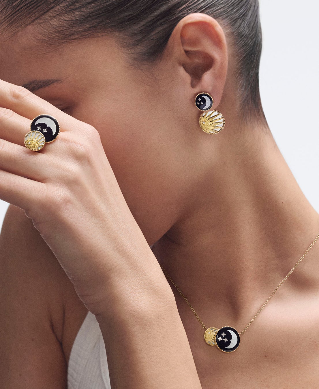 2018年、「ローズ デ ヴァン」の壮大な旅に、「ローズ セレスト」が新たに加わりました。ムッシュ ディオールを魅了した天空や占星術へのオマージュとして、このシリーズは、両面を魅惑的に相互作用させながら、太陽の輝きと月の神秘性を表現します。ゴールド、マザーオブパール、オニキス、プラチナの星々を組み合わせることによって魅力を高めているメダイヨンは、動くたびに両面が反転しながら輝きに溢れ、多面的な魅力が楽しめます。神秘的な天空に誘うような、優美な煌めきに溢れる「ローズ セレスト」の新作ジュエリーを、ぜひご覧ください。