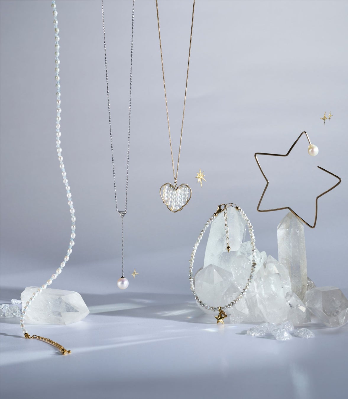 ホワイト、月、パールのアクセサリーをご用意。アクセサリーデザイナーとの会話も楽しみながら、自分だけのお守りジュエリー探しをお楽しみいただけます。