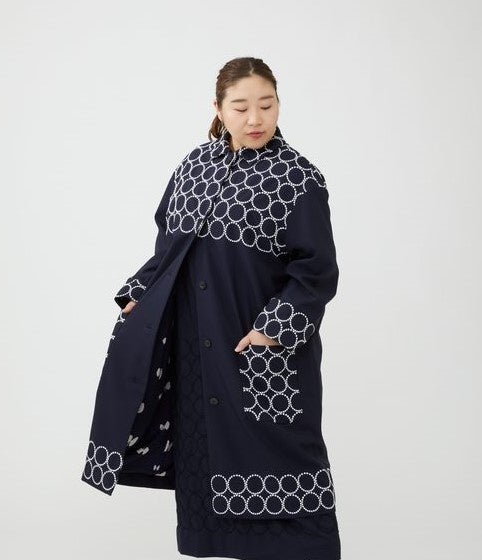 細番手のウール糸で高密度に織り上げたハリのある素材に、<ミナ ペルホネン>の代表的なテキスタイル“tambourine”刺繍が施されたコート。軽やかには羽織れる一枚です。