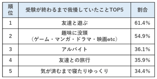 受験が終わるまで我慢していたことTOP5は、友達と遊びながらも一人の時間も大切にしたい様子