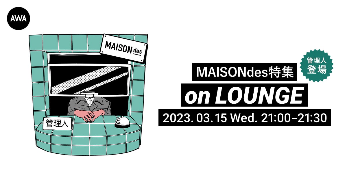 AWA株式会社(本社:東京都港区、代表取締役CEO:冨樫晃己)が運営する、サブスクリプション型(定額制)音楽ストリーミングサービス「AWA(アワ)」は、2023年3月15日(水) 21:00~21:30の30分に渡り、オンライン空間「ラウンジ」で、架空のアパート音楽プロジェクトMAISONdesの管理人がチャットで参加する、MAISONdes特集ラウンジを開催いたします。