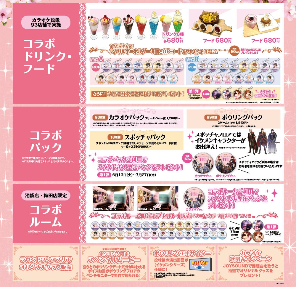 全国のラウンドワン93店舗にてカラオケコラボパックを購入すると、ノベルティとして、コラボ前半期間では大型缶バッジ、後半期間はB4プラマットをプレゼントします。また、対象の楽曲を歌うと豪華賞品が貰える歌唱キャンペーンも開催します。池袋店・梅田店限定で、ルーム全体が「イケメンシリーズ」仕様となったコラボルームが実施され、彼らとのカラオケデート気分を楽しむことができます。