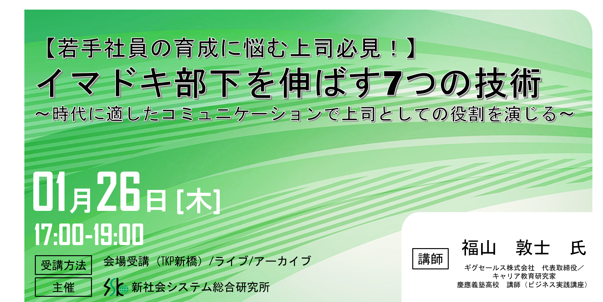 「イマドキ部下を伸ばす7つの技術」と題して、ギグセールス株式会社 代表取締役/キャリア教育研究家 慶應義塾高校 講師(ビジネス実践講座)福山 敦士氏のセミナーを2023年1月26日(木)に開催!!
