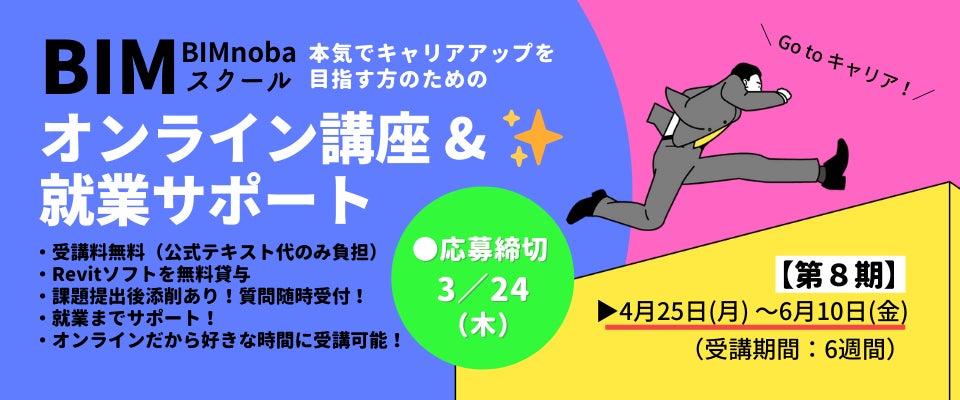 【Autodesk認定】現職中の建築CAD経験者・建築パース作成経験者も歓迎!無料オンラインRevit講座「BIMnobaスクール」8期生の募集スタート!