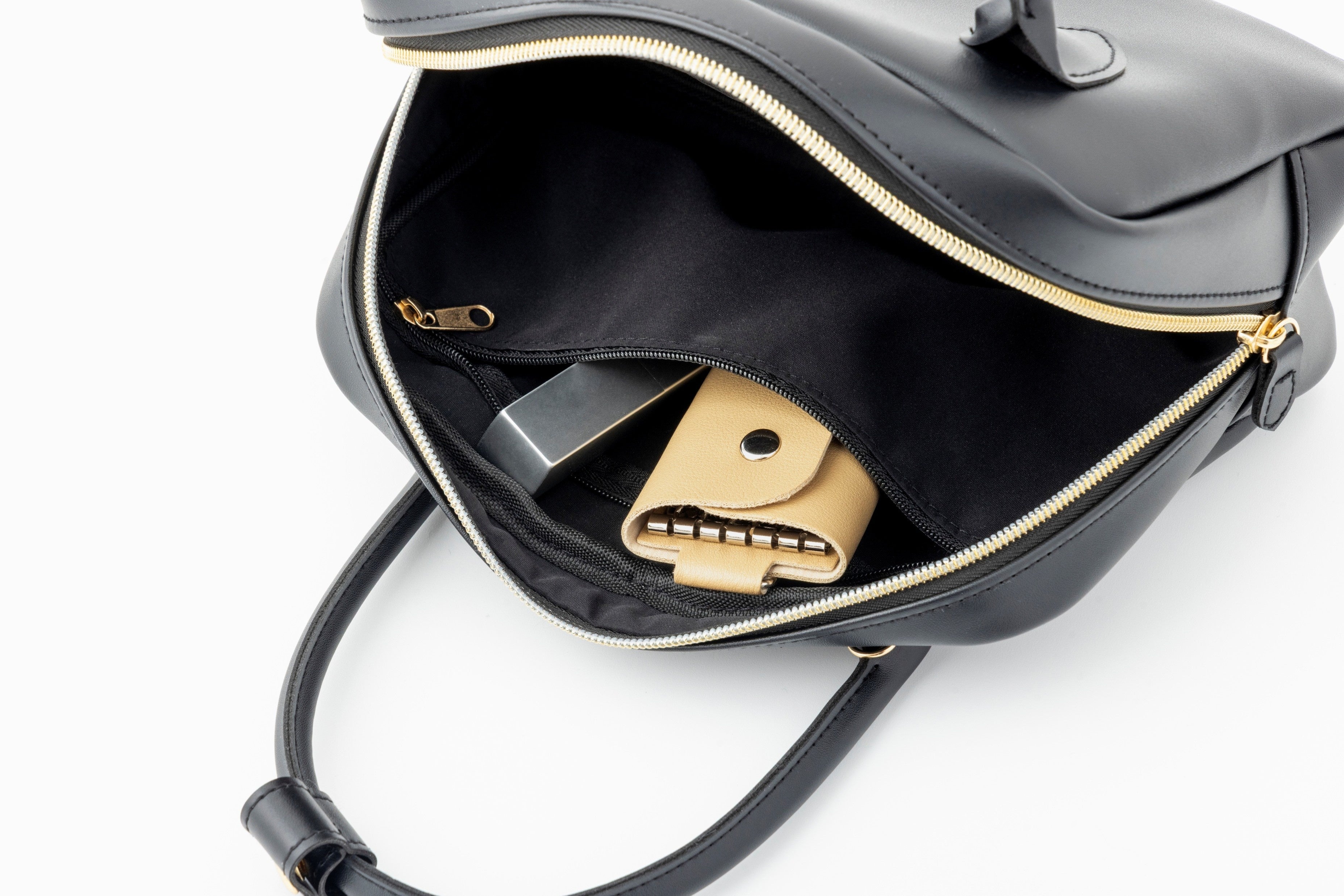 内側にはファスナー付きポケットとオープンポケットがあり、小物を整理しやすい