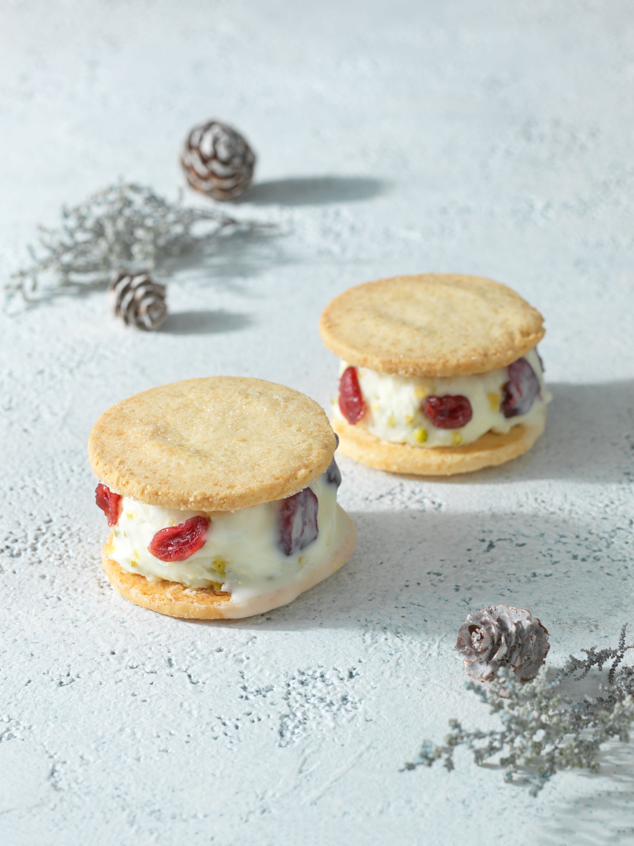 チーズが主役のスイーツショップ<Now on Cheese(ナウ オン チーズ)>は、さまざまなチーズの個性を最大限に生かしたスイーツが魅力です。なかでも「レアチーズサンド・ホワイトベリー」は、北海道産生クリームとクリームチーズ、イタリア産のマスカルポーネを贅沢に使用したチーズクリームを、お店が誇るチーズクッキーに挟んだ一品です。香ばしいピスタチオと、甘酸っぱいクランベリーをトッピングした華やかな見た目で、手土産にもおすすめです。