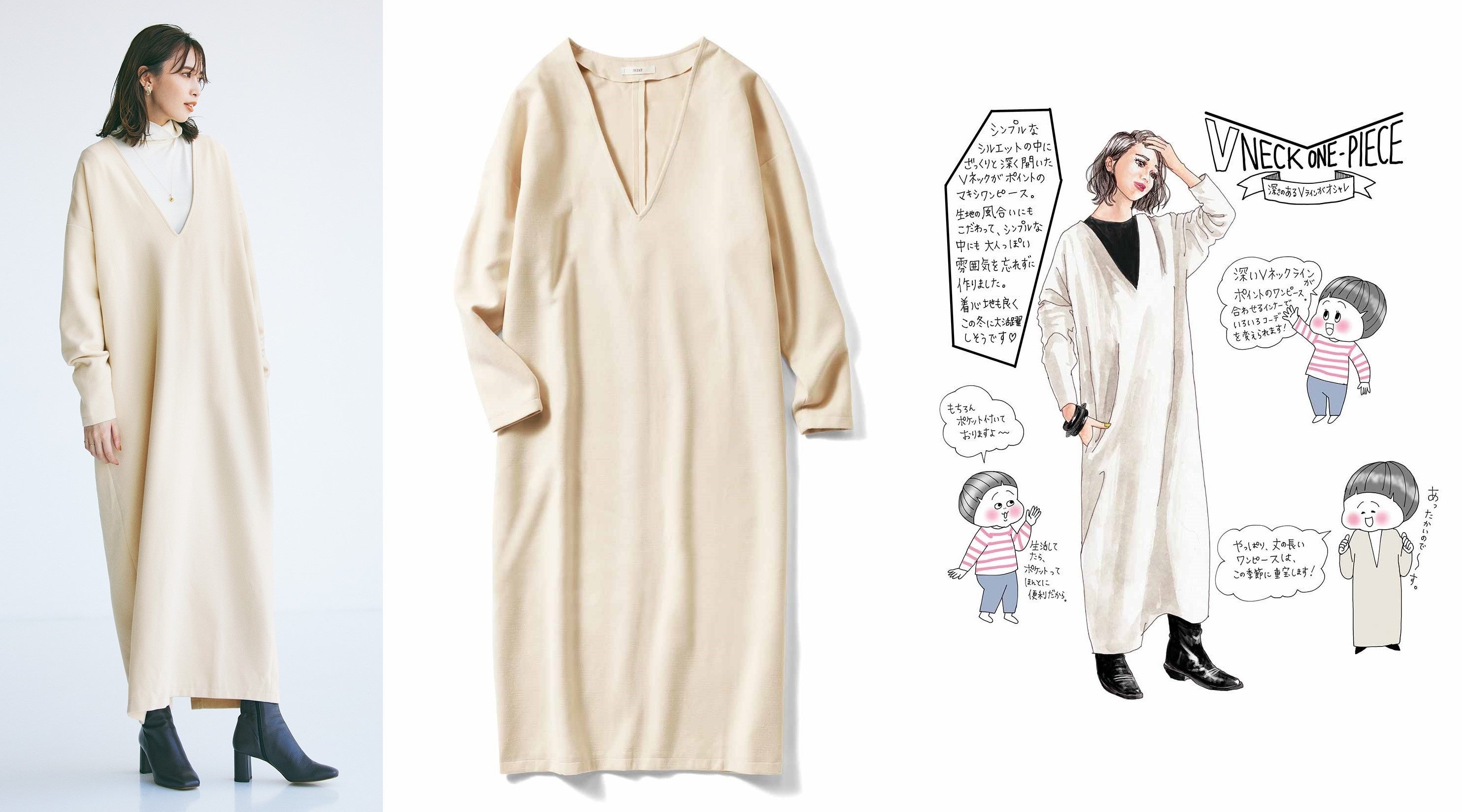おうち着みたいにらくちんなのに、おしゃれ見えする深めVネックのマキシ丈ワンピ。ウールライクなきれいめ素材で、からだにつかず離れずのすとんとしたシルエットに仕上げています。ロンTやハイネックなどとレイヤードが楽しめる深めのVネックは、すっきり見え効果もあります。