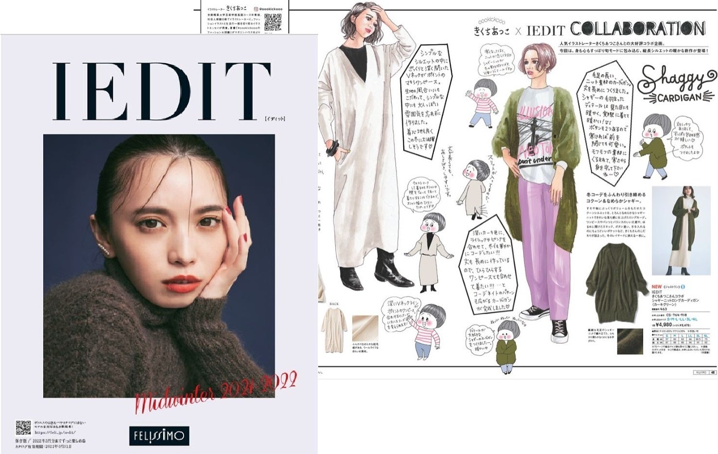 フェリシモが展開するファッションブランド「IEDIT [イディット]」は、インスタグラムフォロワー32万人以上のイラストレーター・きくちあつこさんとのコラボ第19作目となるオリジナル新アイテム、「シャギーニットロングカーディガン〈カーキグリーン〉」、「Vネックマキシワンピース〈アイボリー〉」を発表、11月25日より特設サイトで商品を公開してウェブ販売を行っています。もふもふのシャギーニットカーディガンと、シンプルかつ大人っぽいワンピースは、ともに縦長シルエットでスタイルが良く見え、冬のレイヤードに映えるアイテムです。コラボアイテムは、きくちあつこさんのイラストとともにウェブ特集ページでチェックできます。