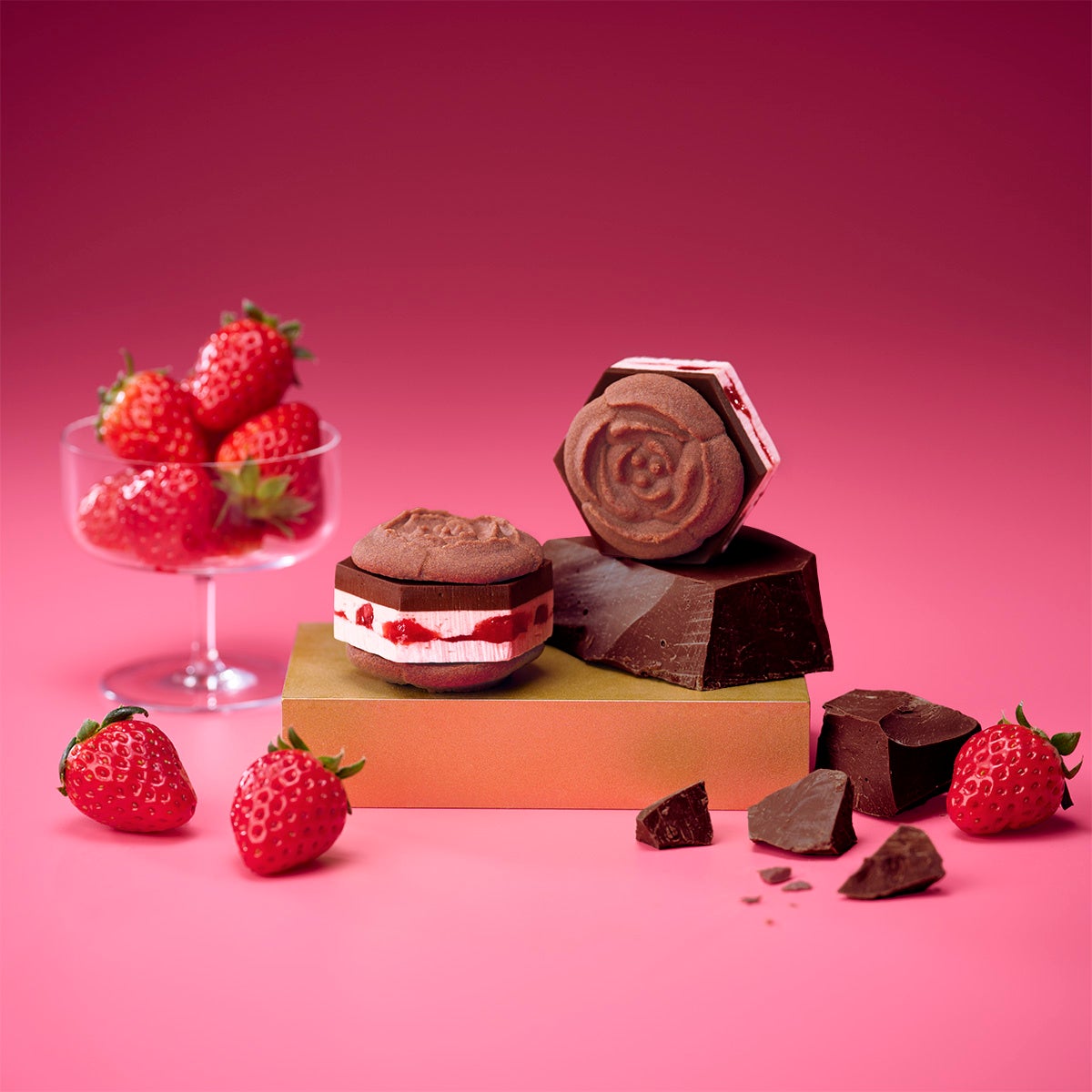 ①ショコラと苺が濃厚にとろけあう大輪のバラのバターサンドです。とろりとろけるショコラガナッシュに、苺コンフィチュール&苺バタークリーム。