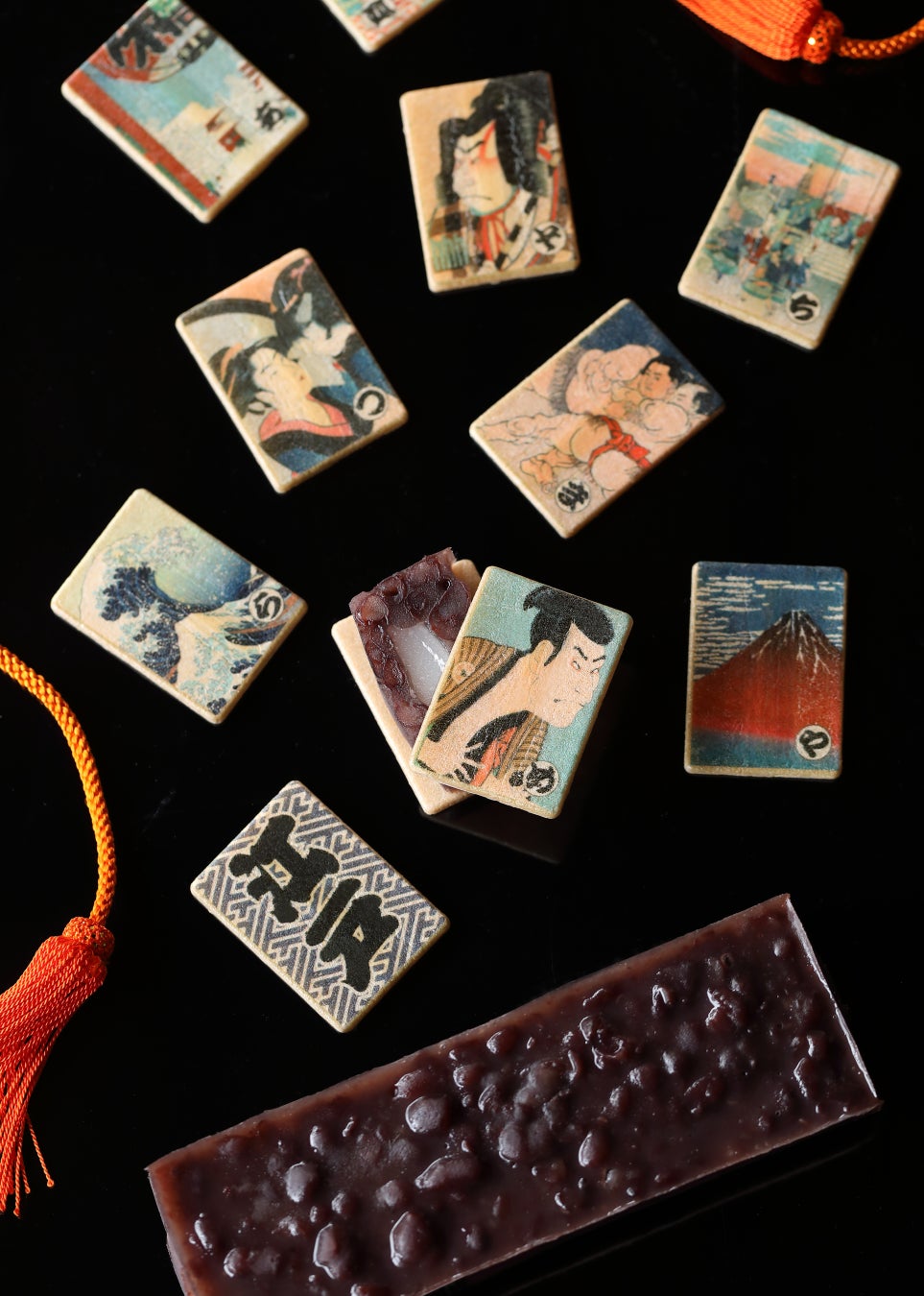 ②浮世絵をモチーフにした歌留多をあしらった近江羽二重もち米の最中種(全十種)。代表銘菓「あも」をはさんでさくさくの手作り最中としてお召し上がりください。