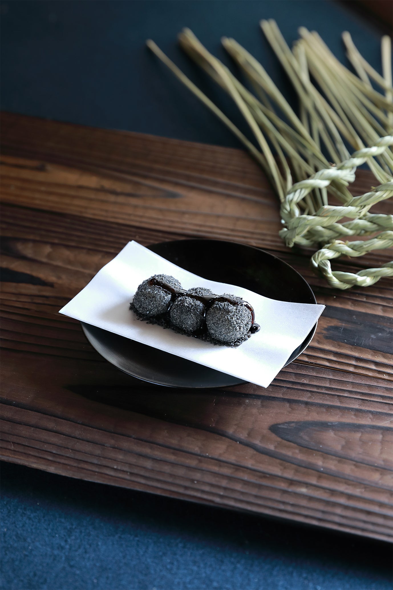 ①叶 匠壽庵が商いを始めたのは、深い歴史をもつ三井寺のほど近く。その古寺に今も湧く「閼伽井屋」の水は天智・天武・持統の御三帝の産湯に使われたと伝えられています。功徳の願いを込めて、三つの餅にあらわしました。コシのあるしっかりとした羽二重餅に、香ばしくコクを出した黒すり胡麻をふんだんにまぶしました。お好みで黒蜜をかけて甘さを加えるとよりあっさりとお召し上がり頂けます。
