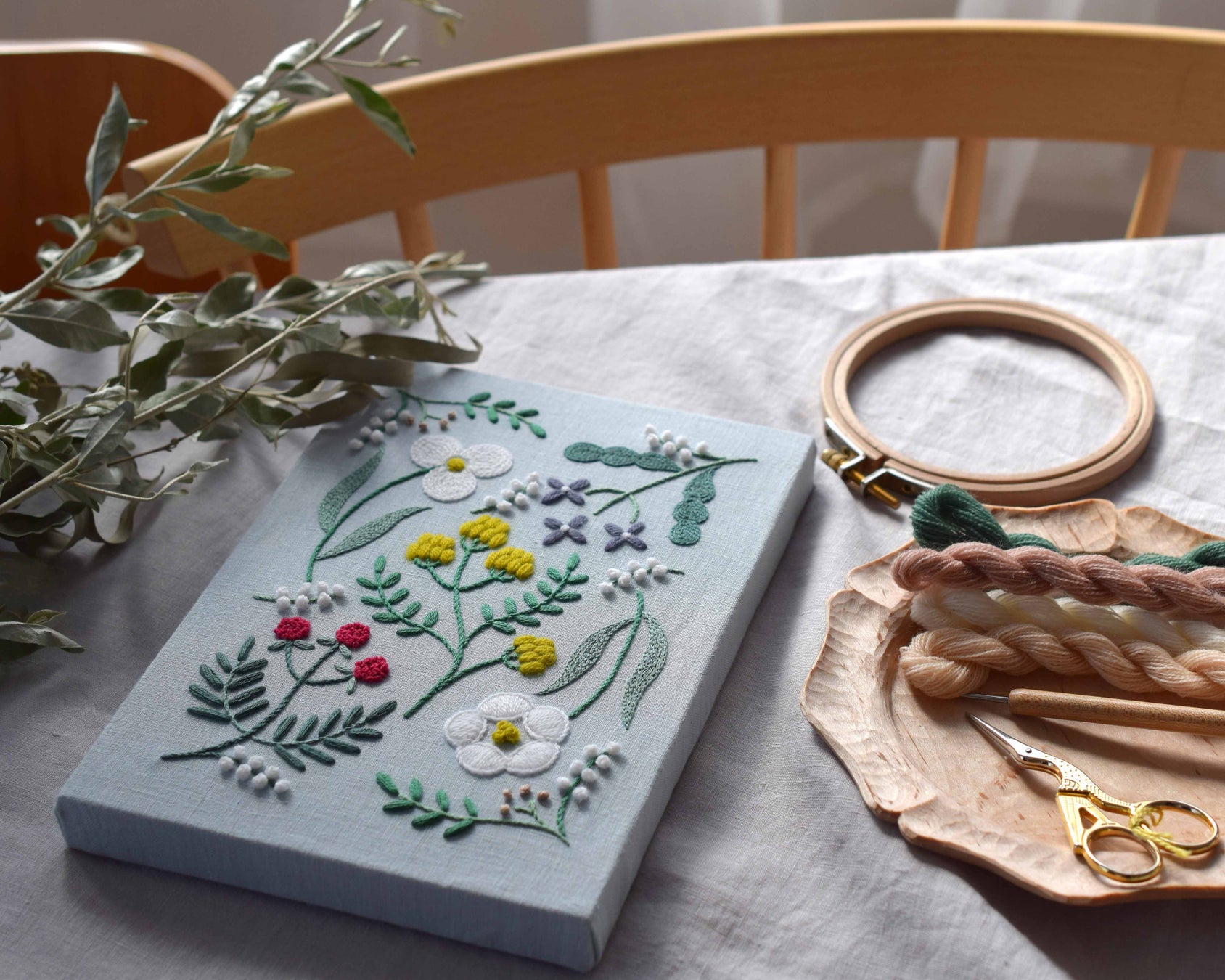 リネン生地、刺繍糸6色・ウール刺繍糸4色、フランス刺繍針(3番・7番)と糸通し、刺繍枠12.5cm、木製パネル