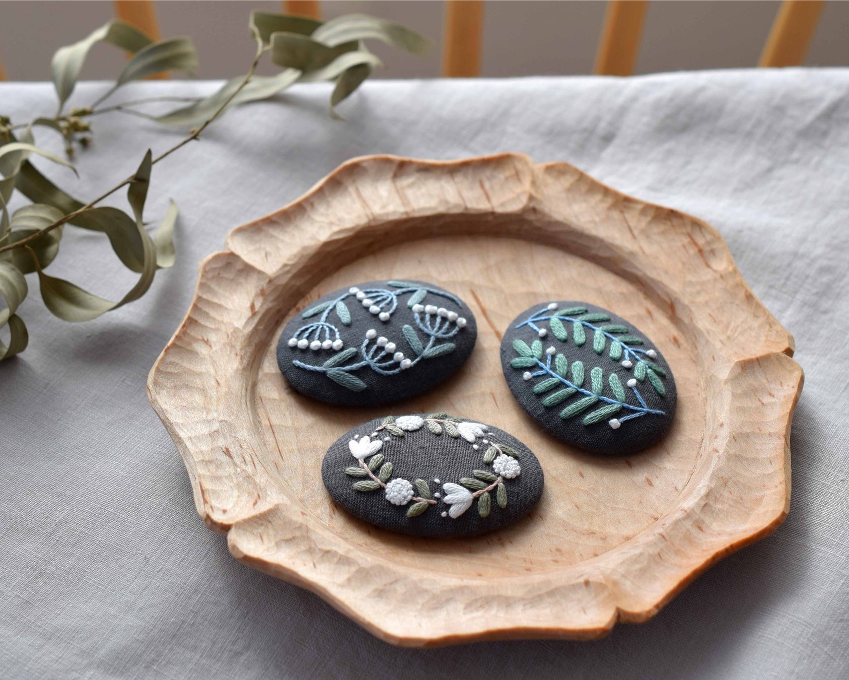 リネン生地、刺繍糸7色、ブローチ仕立てセット3個、説明書、図案