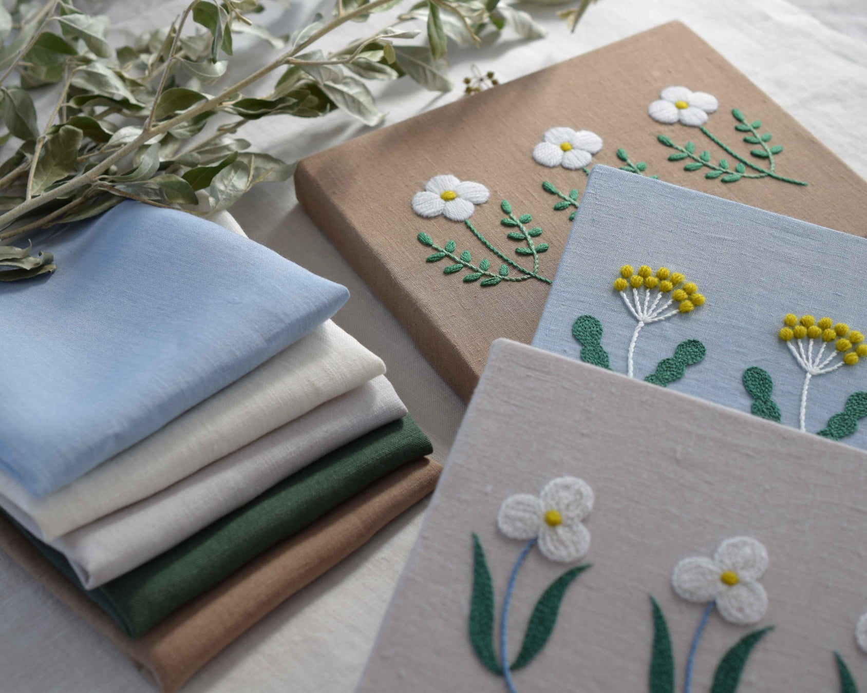 ベルギーリネンのナチュラルカラー5色セットです。ブルー、グレー、オフホワイト、グリーン、ブラウン各色に対応した草木モチーフの5つの図案がついています。図案は、ファブリックパネルにそのまま仕立てられるサイズ(トレーシングペーパーに印刷済み)です。