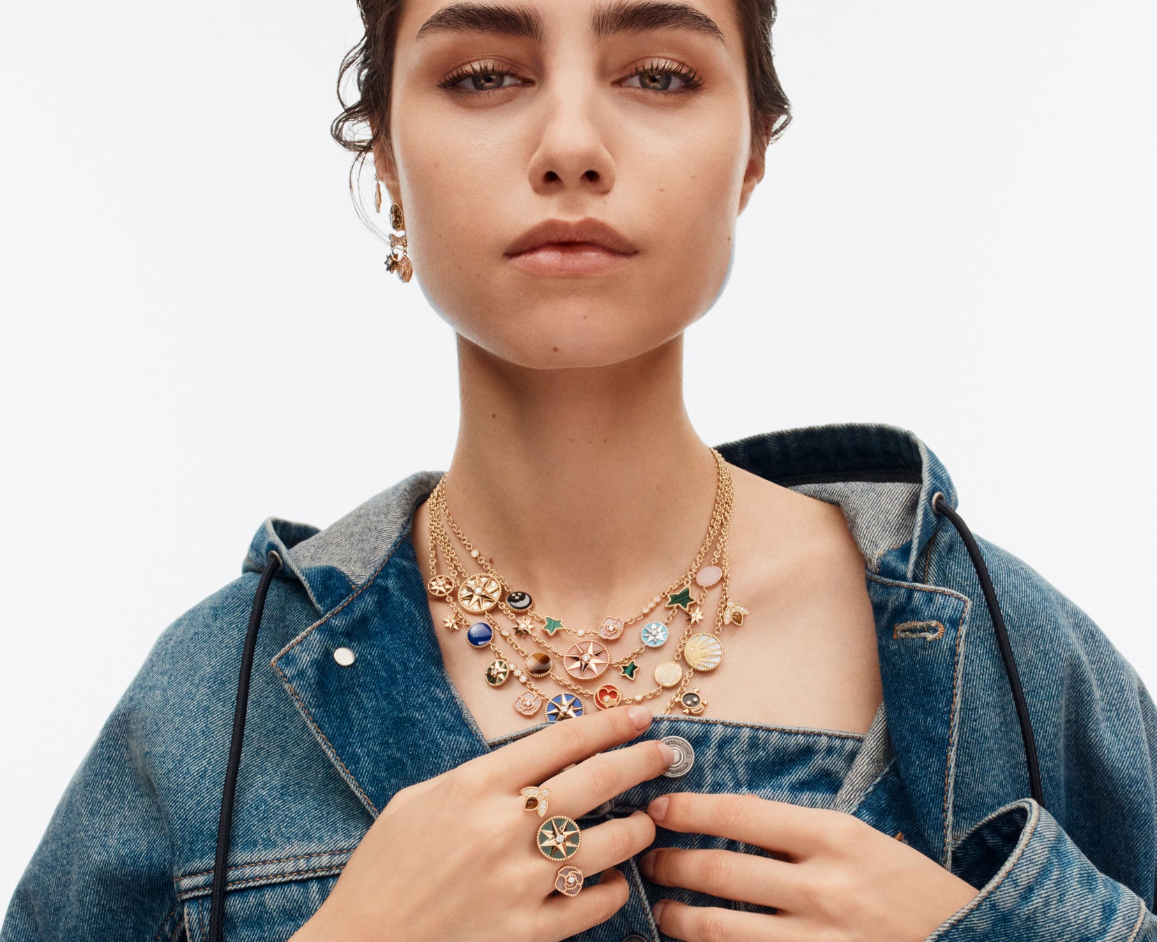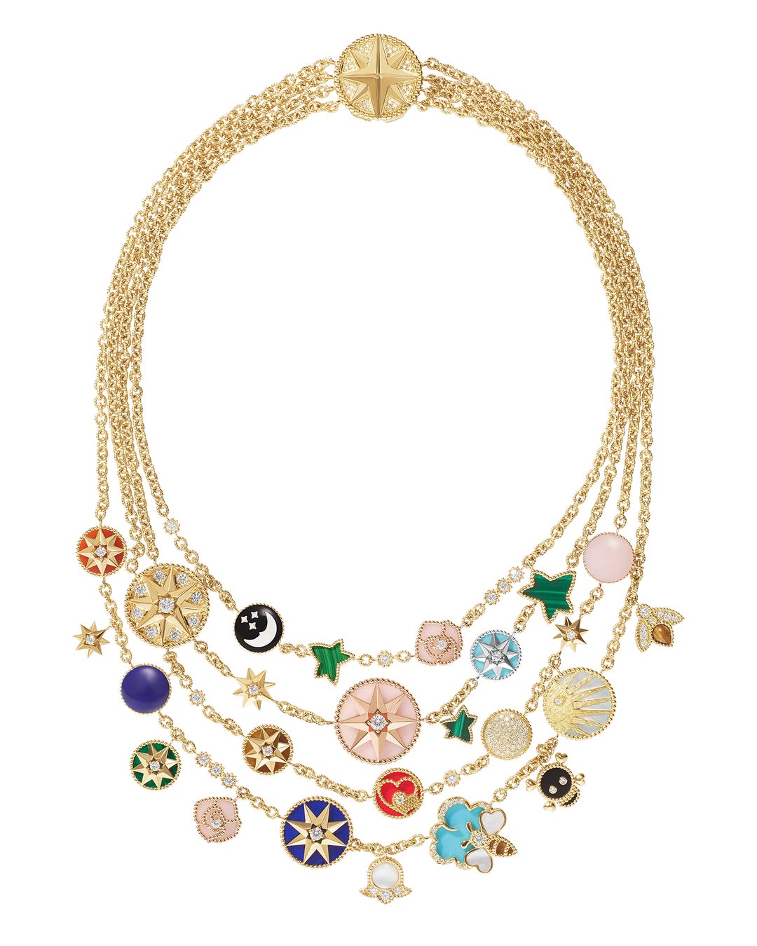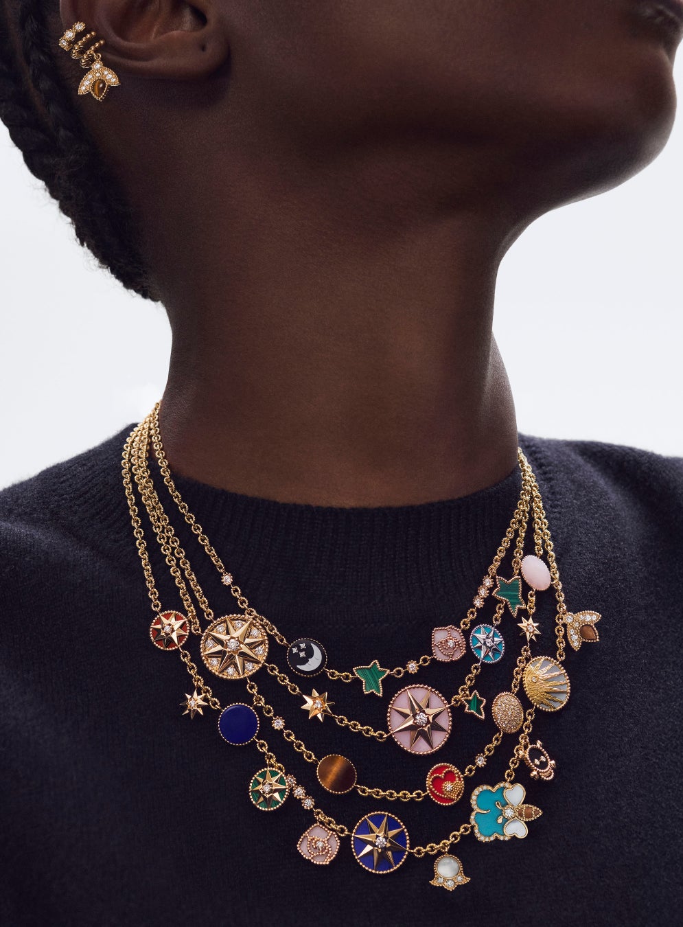 2022年、クリスチャン・ディオールの信心深さを呼び覚ますような魅力を湛える「ローズ デ ヴァン チャーム」が、「ローズ デ ヴァン」に新たなチャプターを加えました。肌身離さず身に着けていたい、エレガントなお守りとして考案された「ローズ デ ヴァン チャーム」は、ムッシュ ディオールが大切にしていたお守りやコードであったミツバチ、バラ、スズランをチャームとして配しました。色とりどりのストーンとラッキーモチーフを配したネックレスやブレスレットは、気持ちを後押しするお守りジュエリーです。