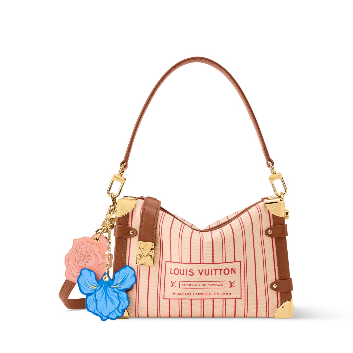 キャンバス地にバッグ「ネヴァーフル」のライニングから着想を得たプリントを施した、旅のお供におすすめのバッグ「サイドトランク MM」。メゾンらしさが光るトランク風コーナー部分やSロックスタイルの留め具、今シーズンならではのフローラルチャームが彩りを添えています。必需品を収納するのに充分なスペースを備えています。