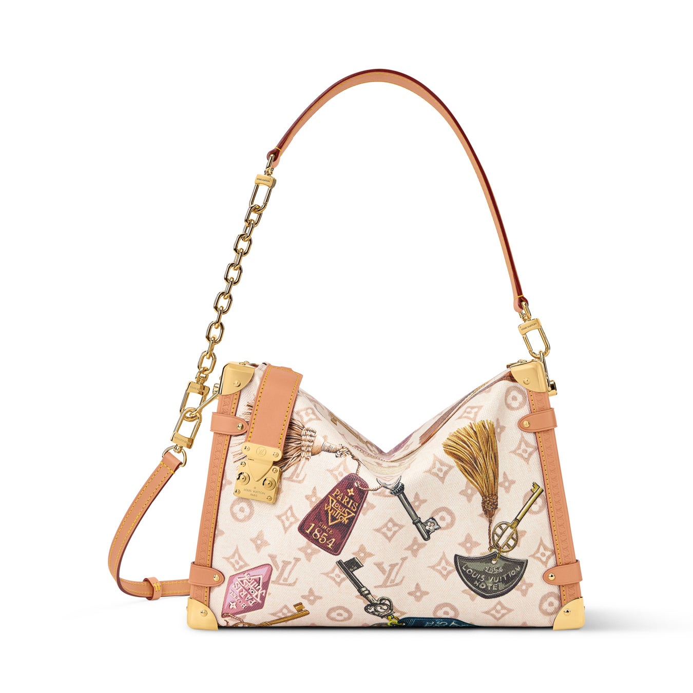 メゾンの旅の伝統を讃える、「フライト·モード」コレクションに遊び心溢れるアレンジを加えた「サイドトランク GM」。モノグラム·デュンヌ キャンバスにホテルの鍵を想わせるカラフルなモチーフをあしらい、プレタポルテ(洋服)·コレクションの魅力的なパターンを再現。メタリックなコーナー金具や洗練されたゴールドカラーのメゾンを象徴するSロックスタイルの留め具を配した、シックなデザイン。