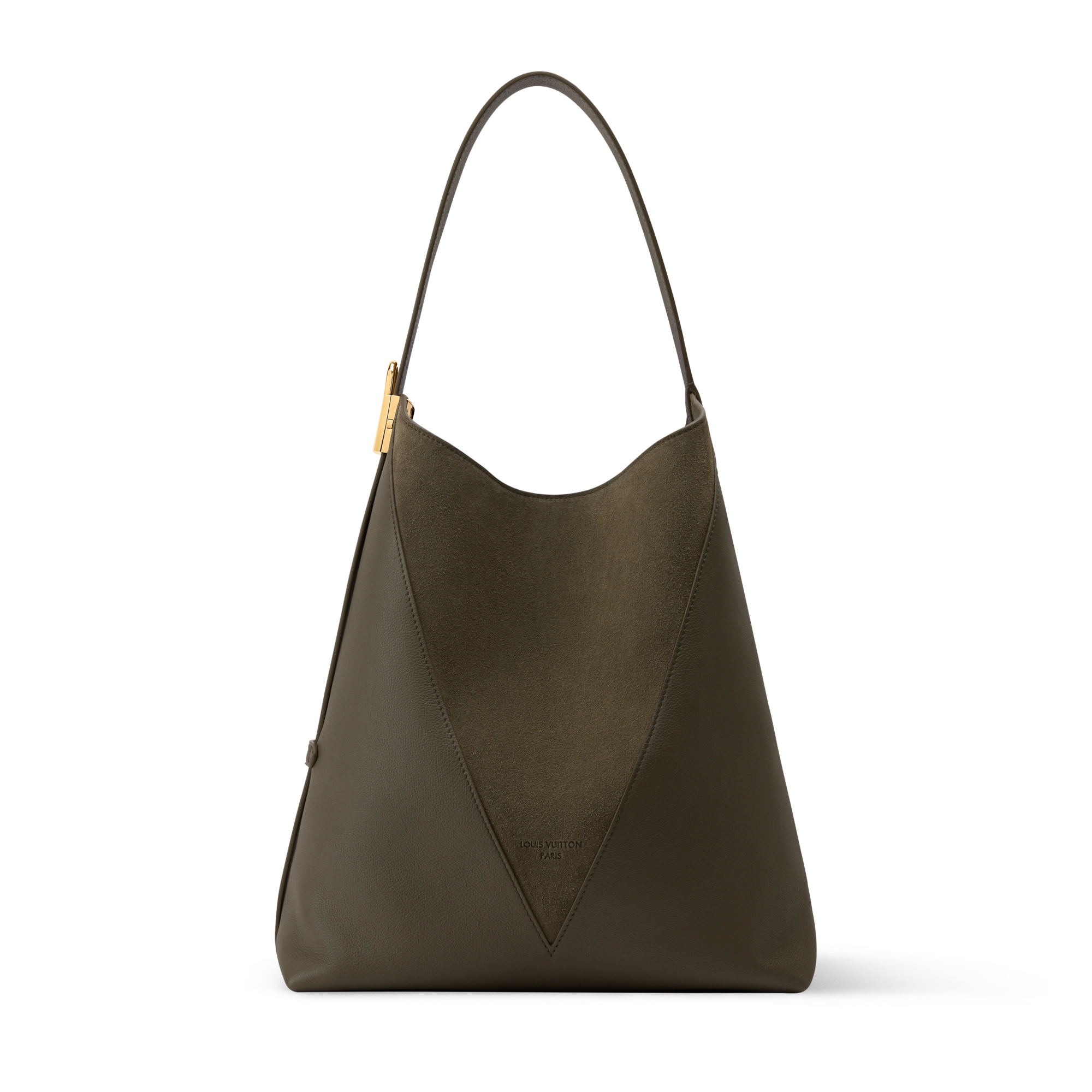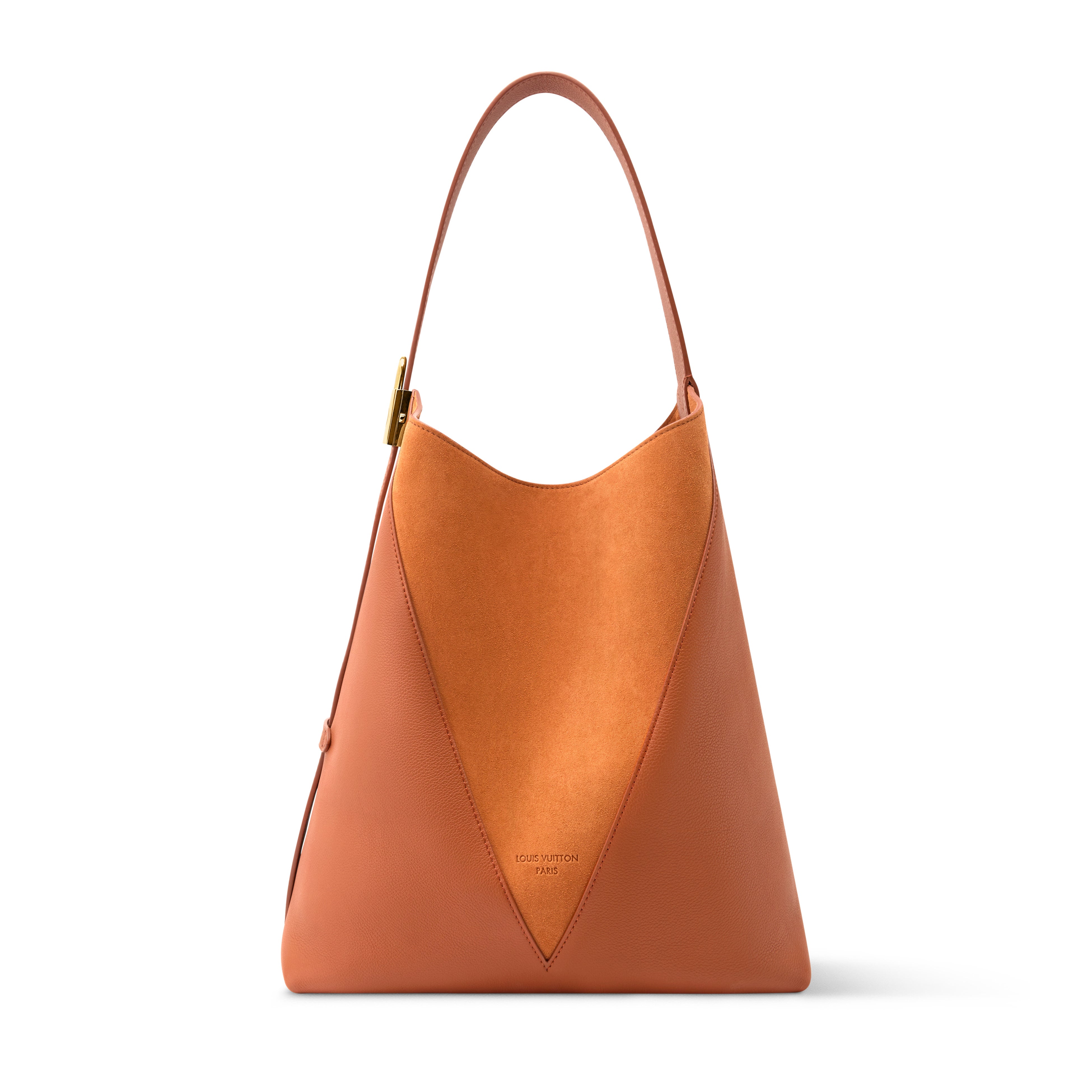 ガストン-ルイ·ヴィトンのパーソナライズされたトランクを想起させる「V」字パネルをあしらった「ホーボー MM」。カーフレザーとスエードを組み合わせたタイムレスなアースカラーの色合いで仕上げ、ゴールドカラーの金具がエレガントな印象をプラス。ノートパソコンやノートなどの日常の必需品が収納できる、ゆったりとしたサイズ。
