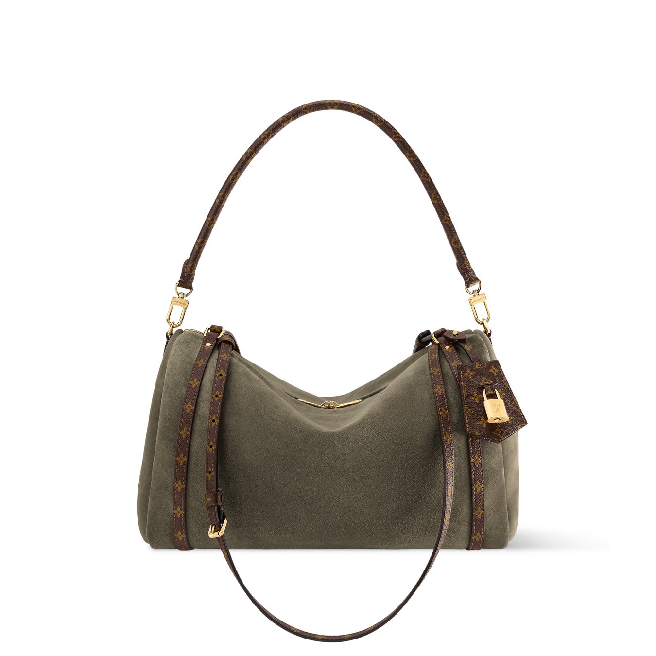 洗練されたカーキのスエードで再解釈した「エクスプレス MM」。メゾンを象徴するモノグラム·キャンバスのトリミングを施し、ゴールドカラーのパドロック(錠前)をあしらったアイコニックなキーベルはファスナー引手にも取付けられます。長さ調節可能なハンドルを備えたエレガントなデザインは、日常の必需品がしっかり収まります。