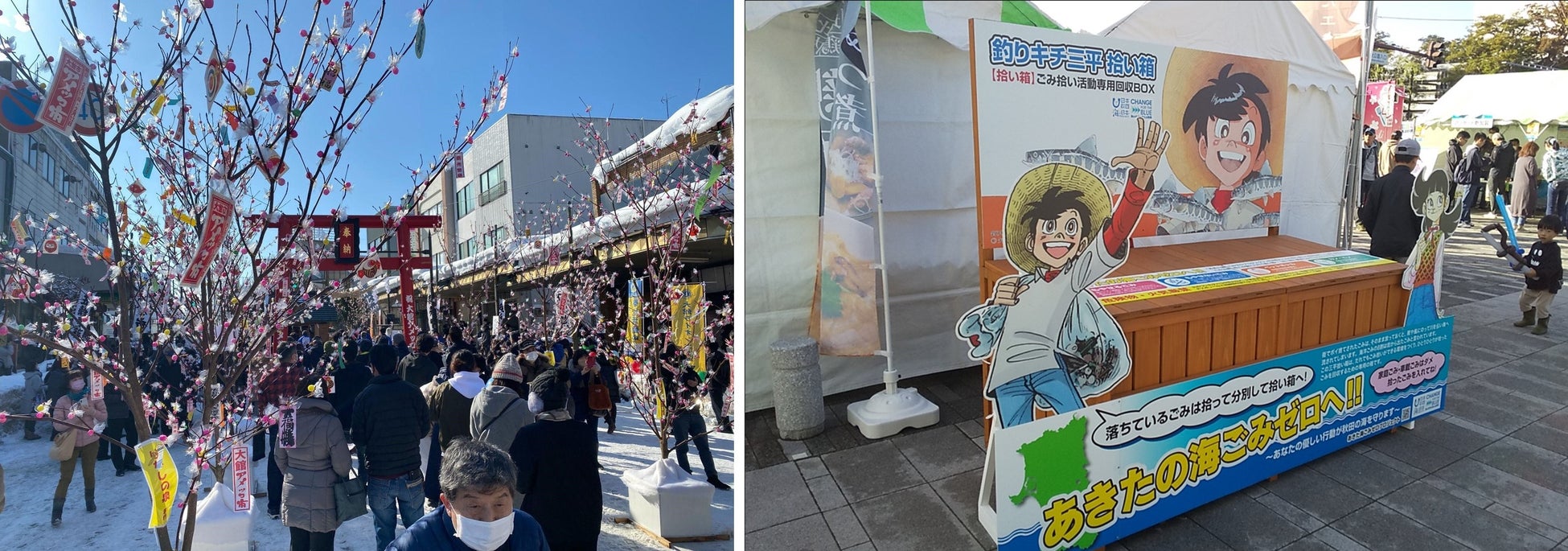 2日間で約6万人が訪れる大館アメッコ市。会場を訪れた方々に、私たちが身近にできるごみの分別や、ポイ捨て防止、拾い箱の啓発活動、釣りキチ三平ごみ拾い隊による会場周辺の清掃活動も実施し、多くの方々に海洋ごみゼロを目指す活動の啓発活動を行います。