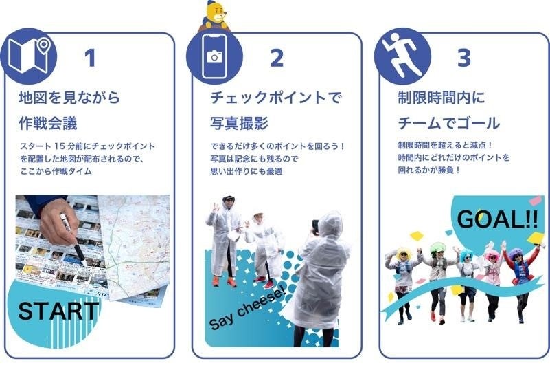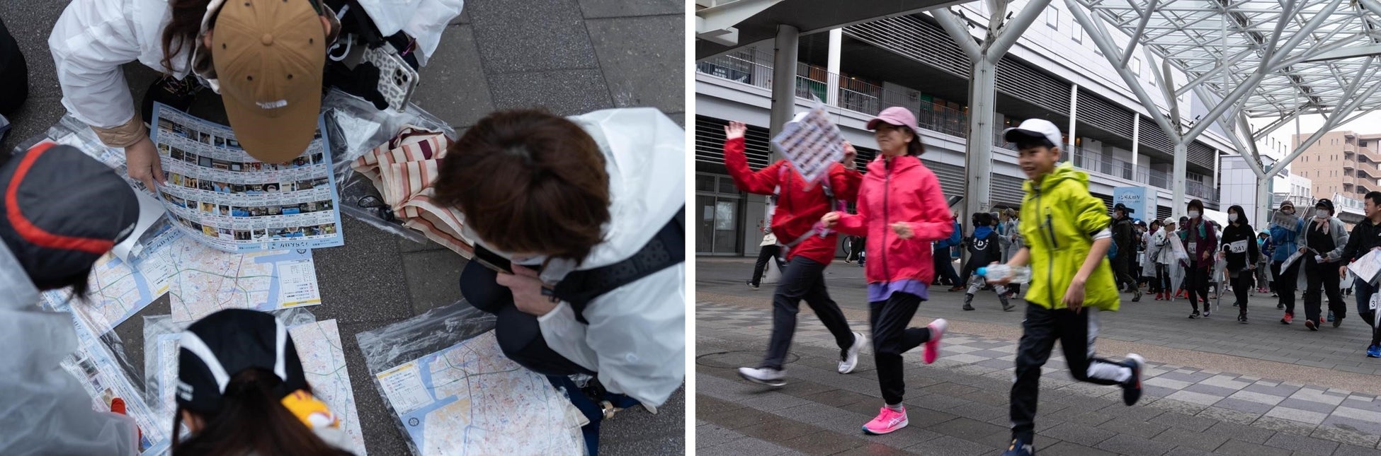 (1)スタートの約15分前にCPが記載された地図を配布します。その地図を見ながら「どこを巡り」「どのルートを通るのか」をチーム内で相談し戦略を立てます。マラソンのようにルートは決まっていません。そのため、自身の体力に合わせてコース設定ができるため、老若男女問わず参加できます。