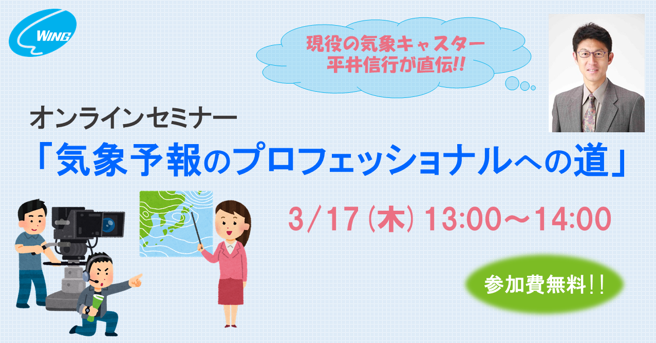 株式会社クリーク・アンド・リバー社(C&R社)の映像分野のグループ会社・株式会社ウイングは3月17日(木)、気象予報士やテレビ番組の気象キャスターなど、気象予報関連のお仕事への就業をめざす方々を対象に、現役の気象キャスター・平井信行による無料のオンラインセミナー「気象予報のプロフェッショナルへの道」を開催いたします。
